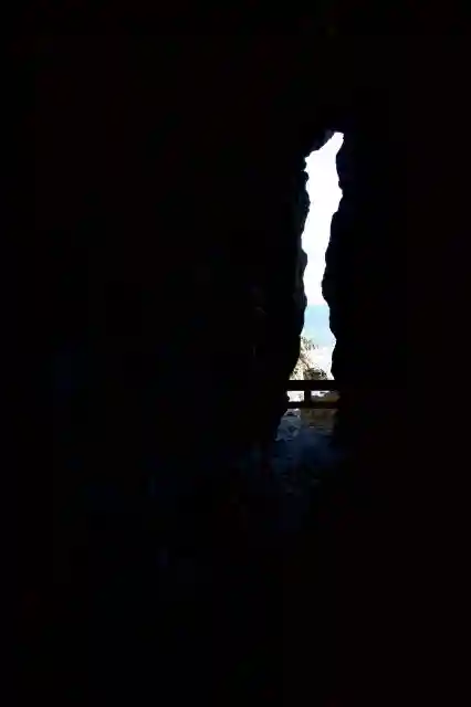 元城跡である軽い山道を進むと階段から海に出ることができ、ゴツゴツした道から大きな岩窟に入ることができる。真ん中を通らないと転倒の恐れあり。