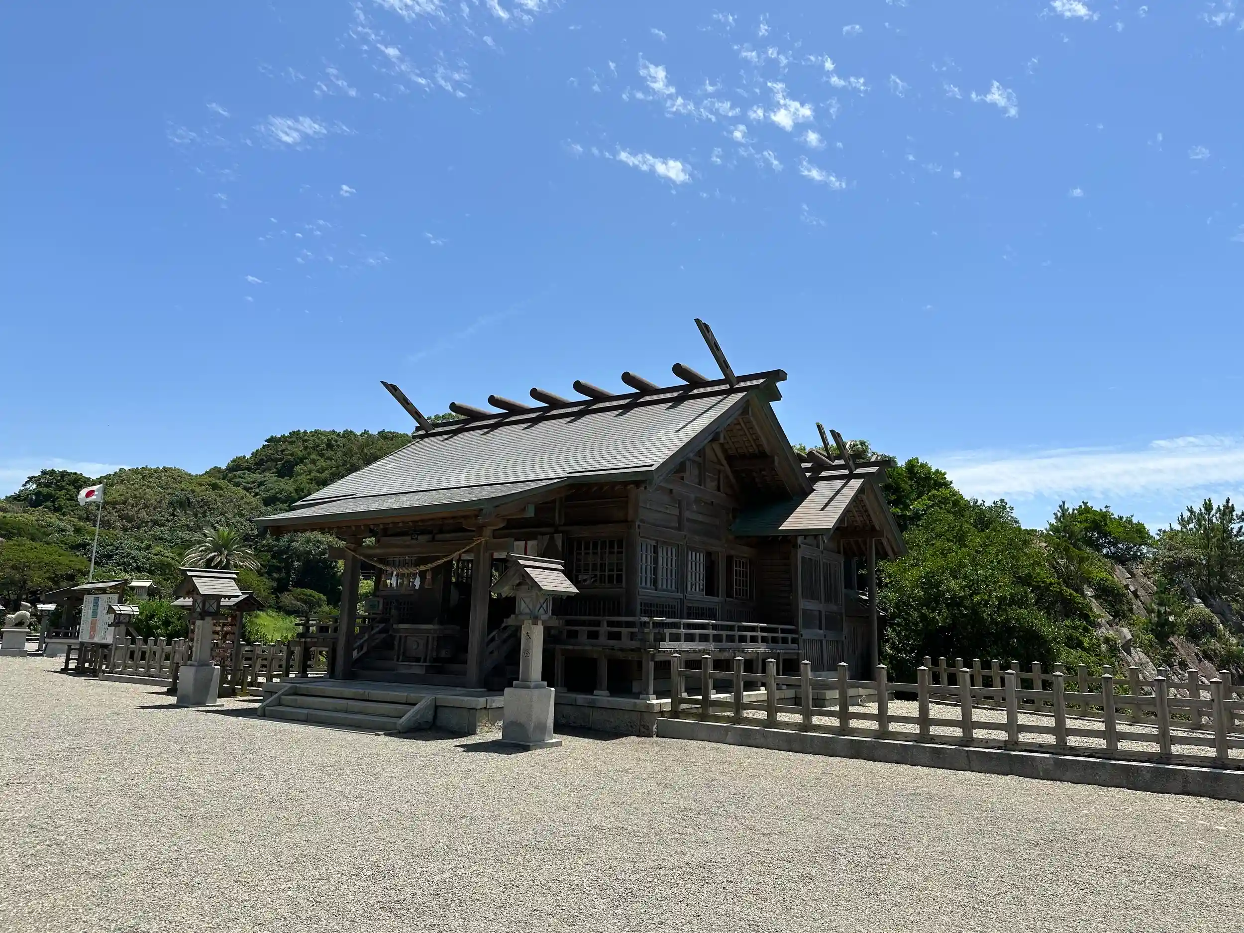 本殿裏の波打つ柱状岩と相まって独特の雰囲気を醸し出し、特に海岸より観る姿は実に美しい。