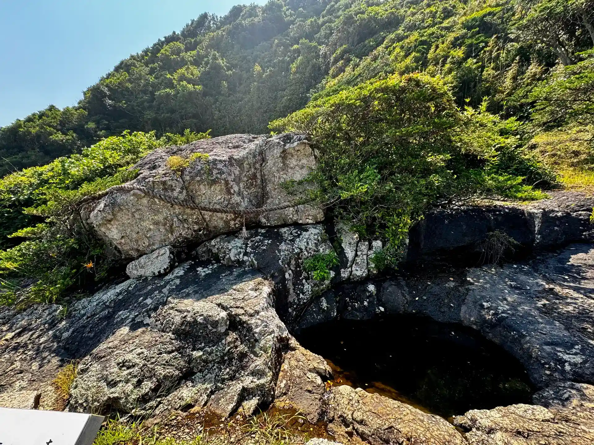 立ちこめる木、竹藪を切り開いて進むと、山際の前に珍しい岩が発見されました。