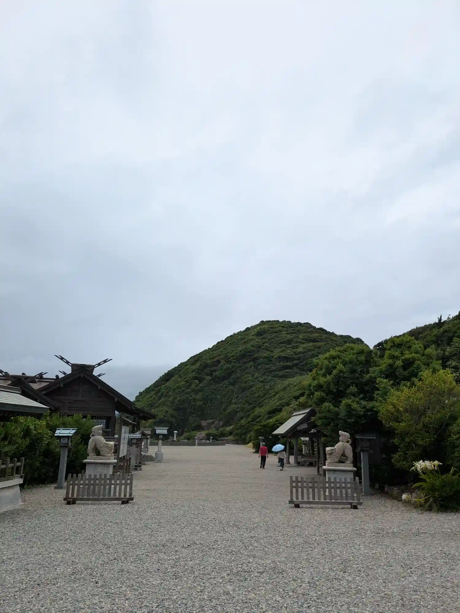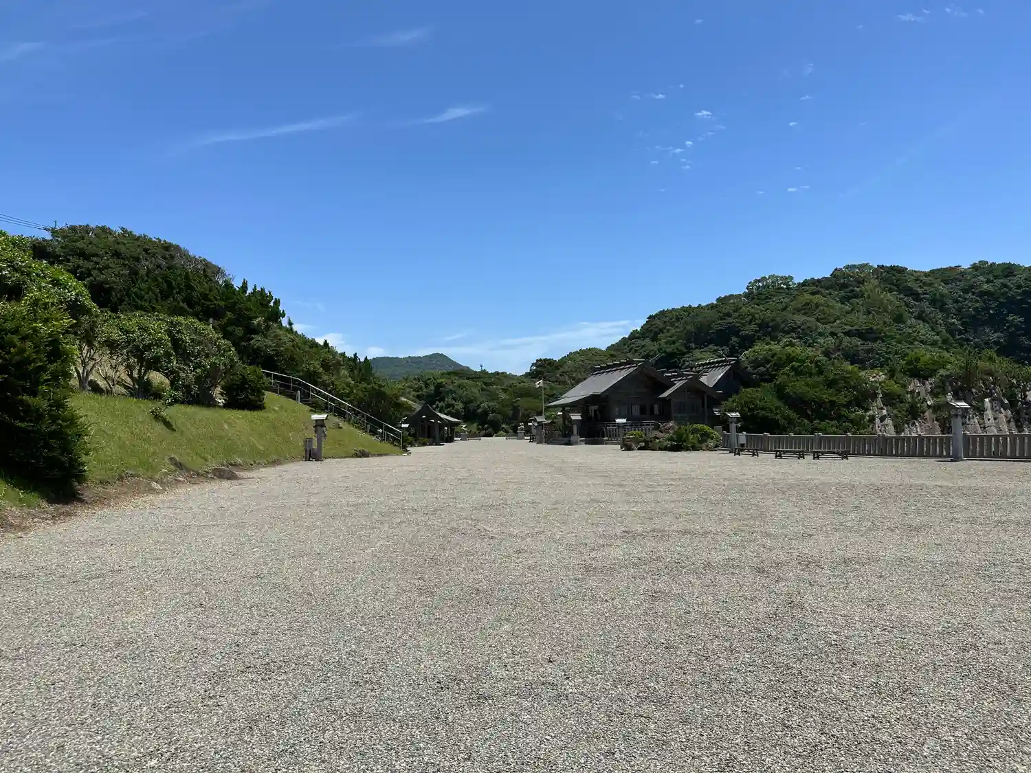 <日本一大きなさざれ石>から見た境内全景。樹木が少ない境内はかなり広い。