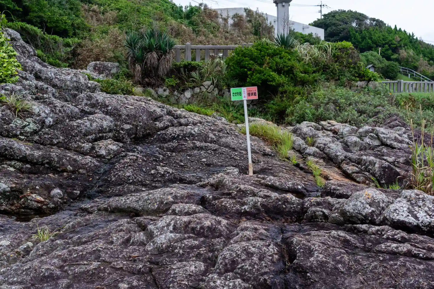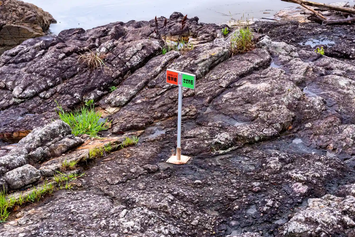 写真の左側が<火砕流による柱状岩>、右側が<さざれ石>と示されている。