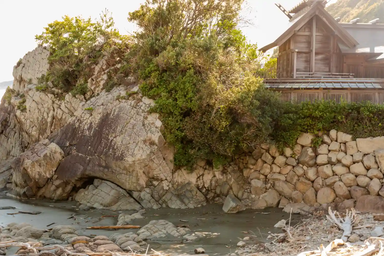 最後に砂浜近くから<社殿>方向を望む。本殿後方の柱状節理の造形が美しい。(^▽^)/