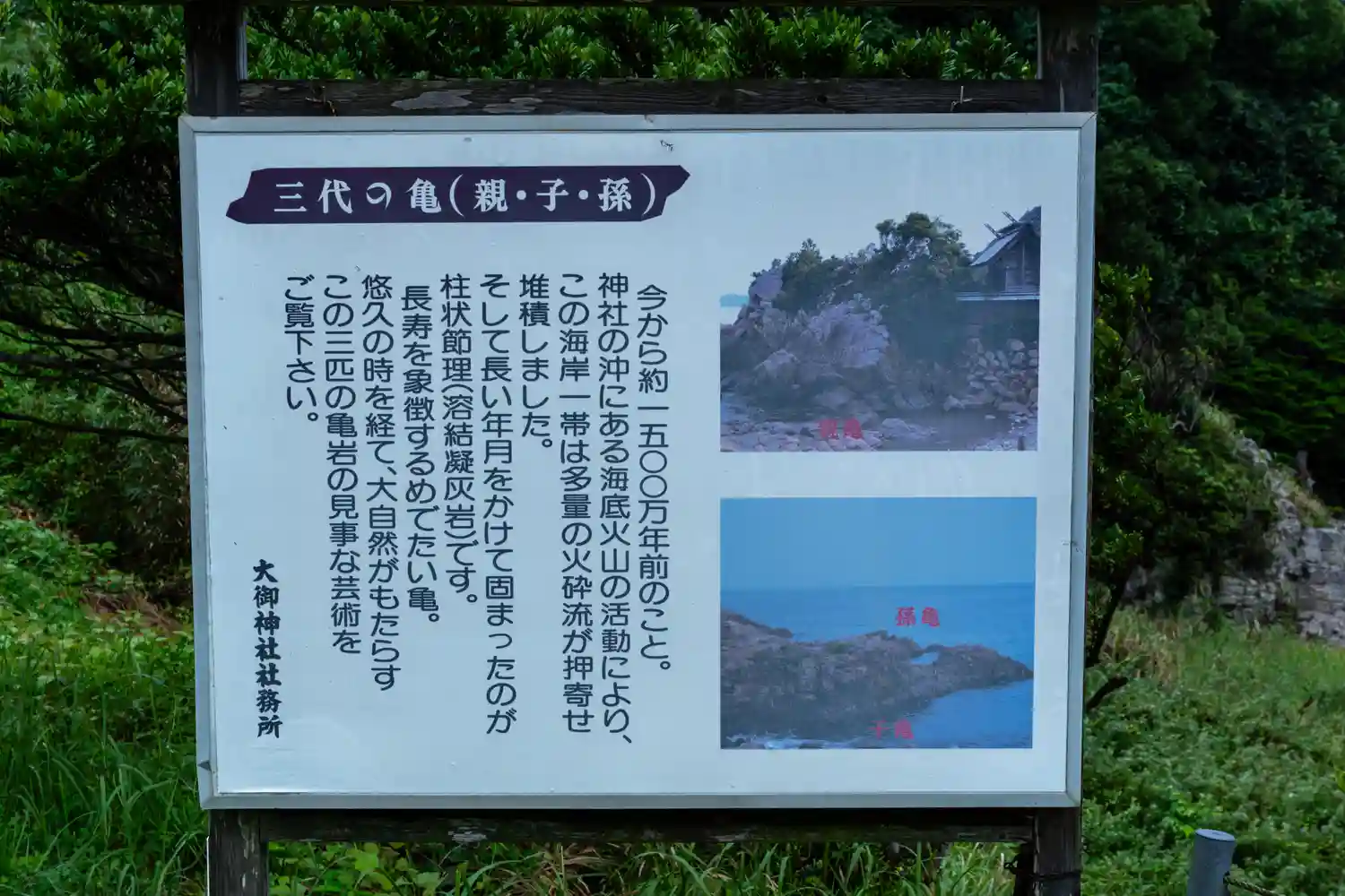 大海原を見渡す絶景の柱状岩上に建つ大御神社は、古くは天照皇太神宮と言われ、天孫瓊瓊杵尊が皇祖天照大…