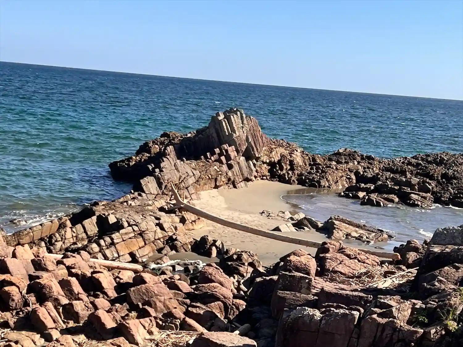 柱状岩の先に砂浜がある。