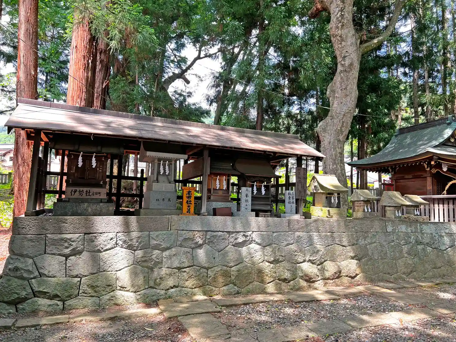 左から順に<伊勢社(治田町)>、<高市社(上八日町)>、<三峯社(本町)>、<秋葉社・三峯社(上八日町)>。その右側は表札なしの石製小社4社。