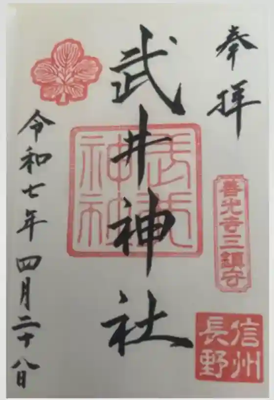 ※当社は、美和神社(式内社)、健御名方富命彦神別神社(城山県社水内大社)(式内論社(名神大))を兼務しているため、各社の御朱印は当社で拝受できる。