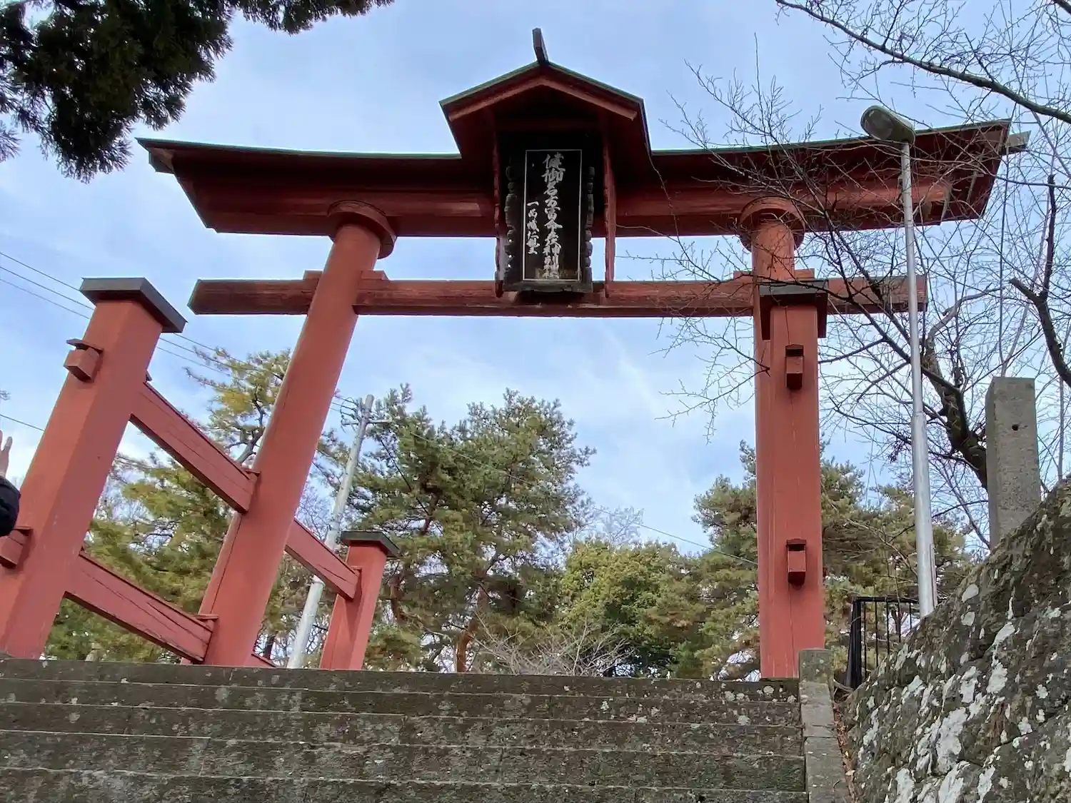 境内南端入口の<鳥居>と<社号標>。城壁のような石垣の上に大きな両部鳥居。