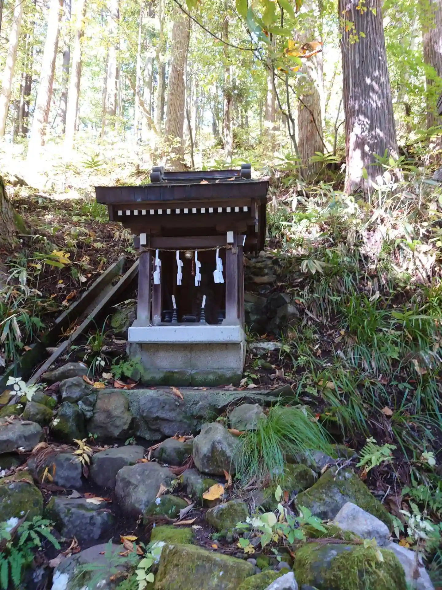 木々の間の急な階段を登り参拝。