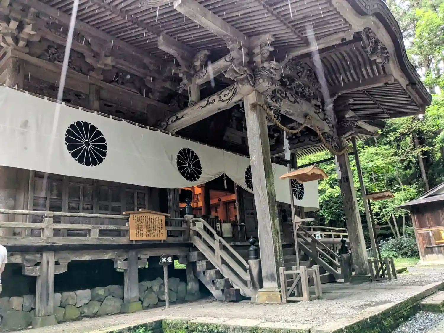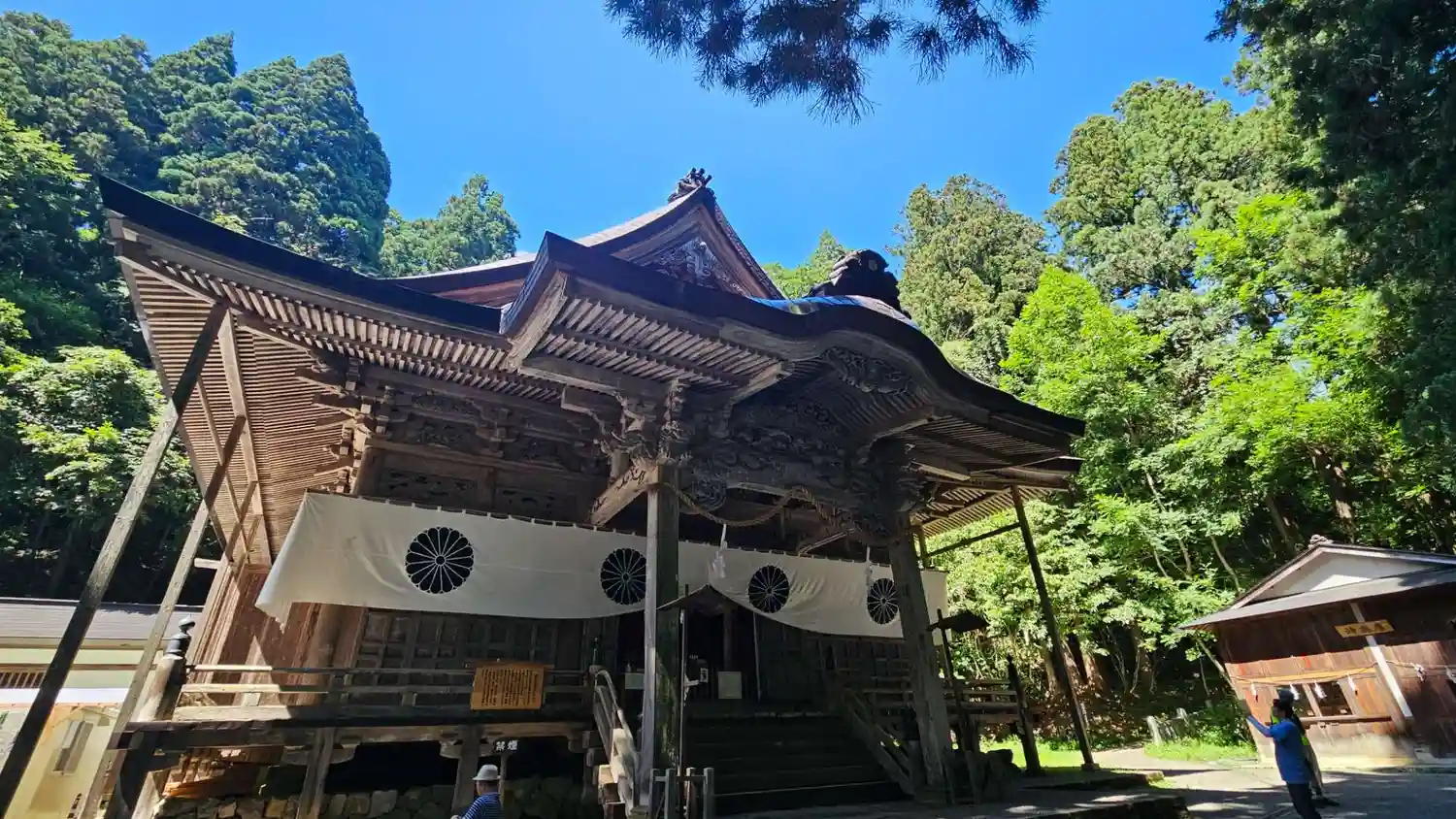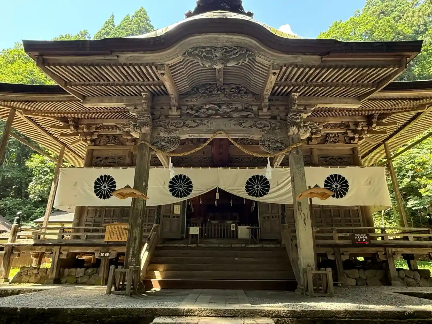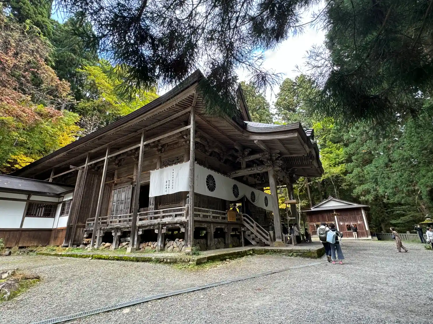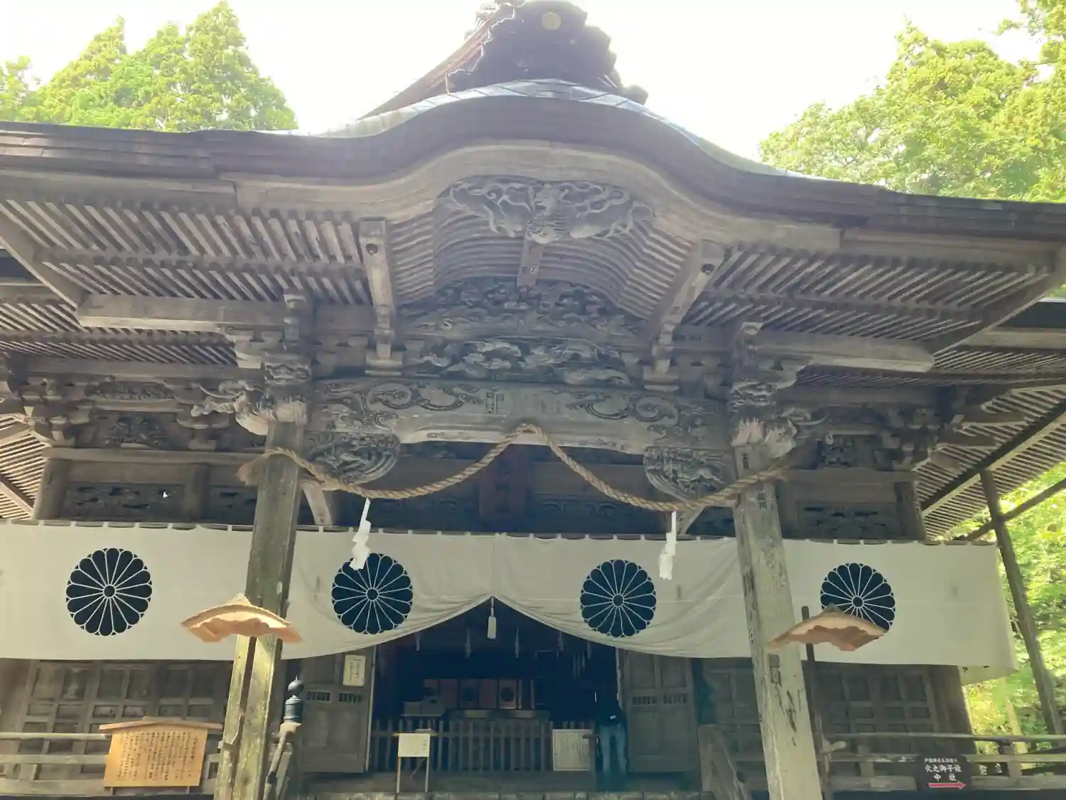 戸隠神社五社巡り。最初に参拝した御社殿は「宝光社」です。白地に菊の紋が描かれている幕が掲げられ「戸…