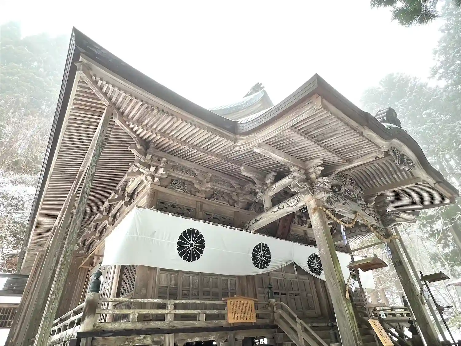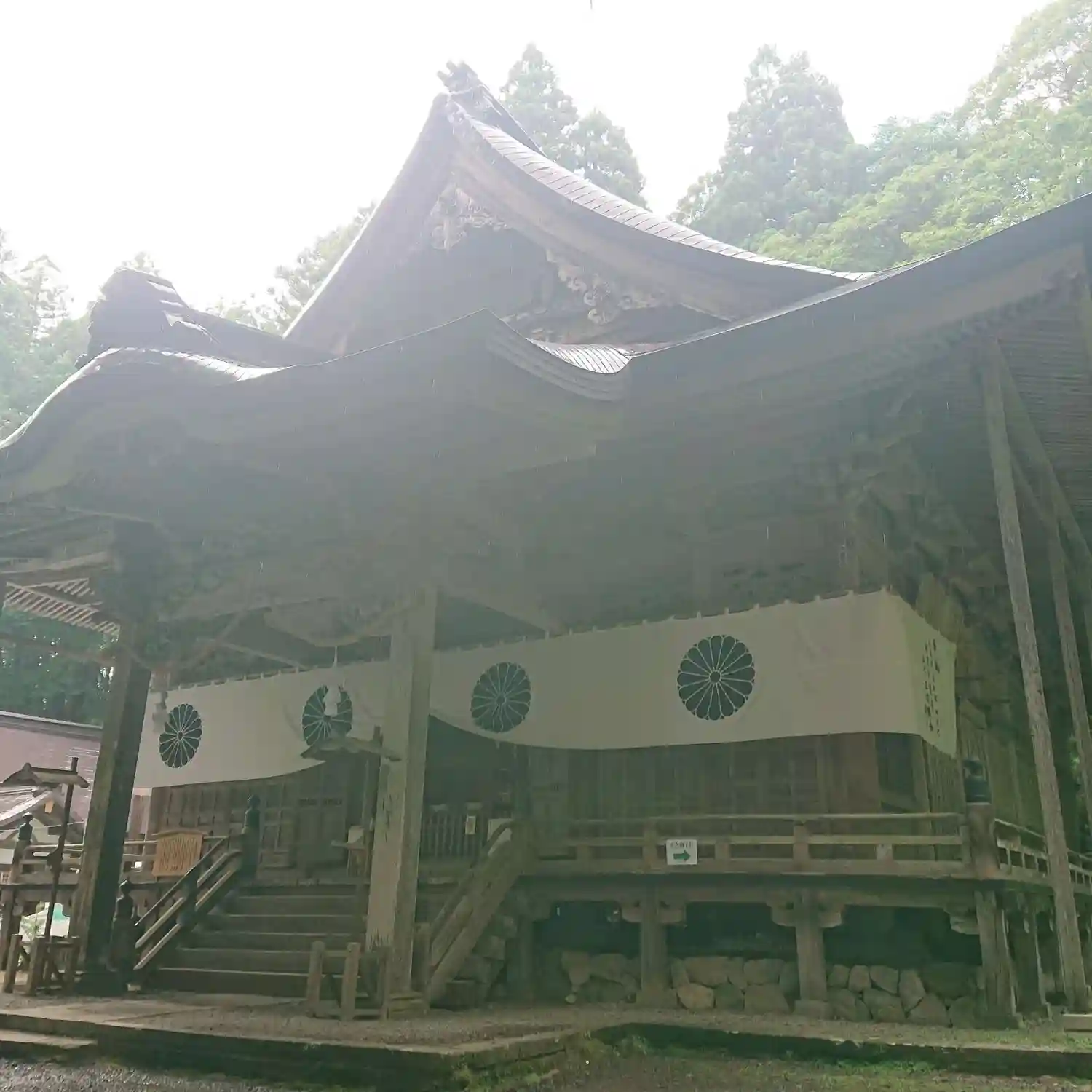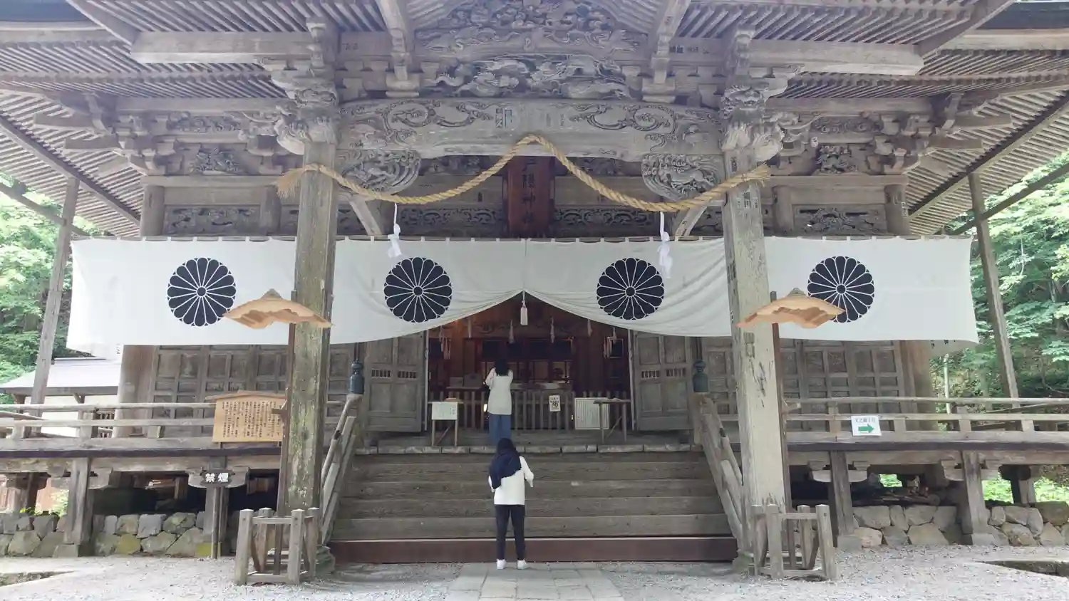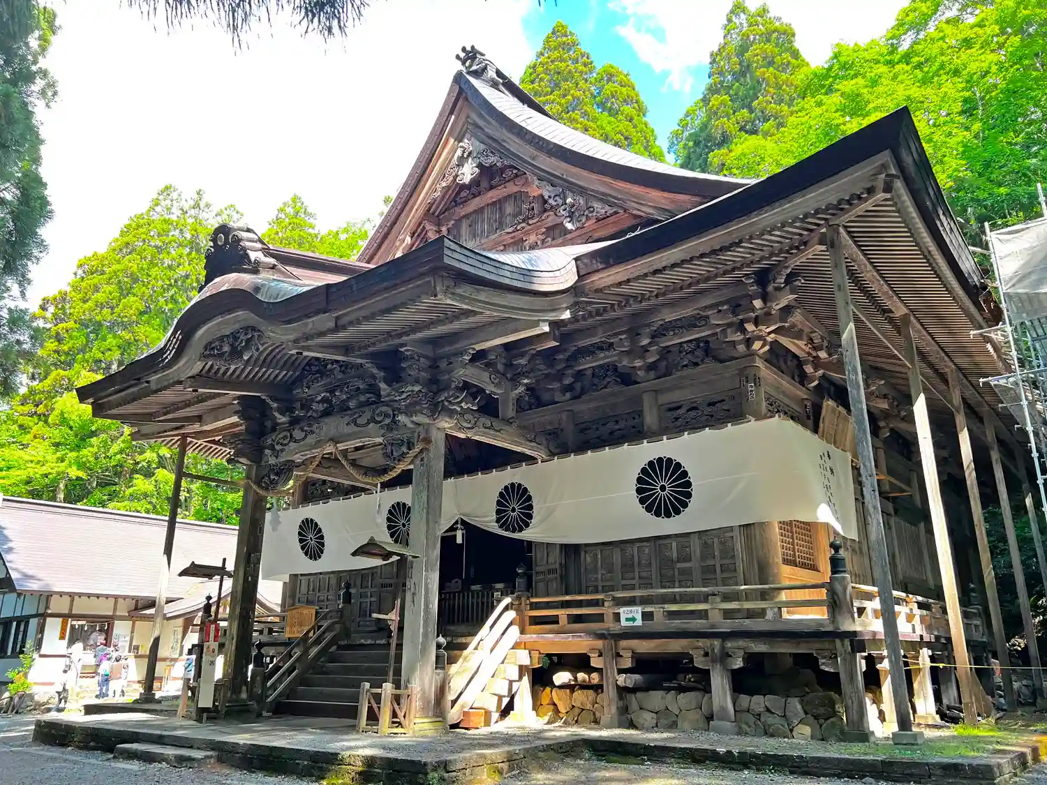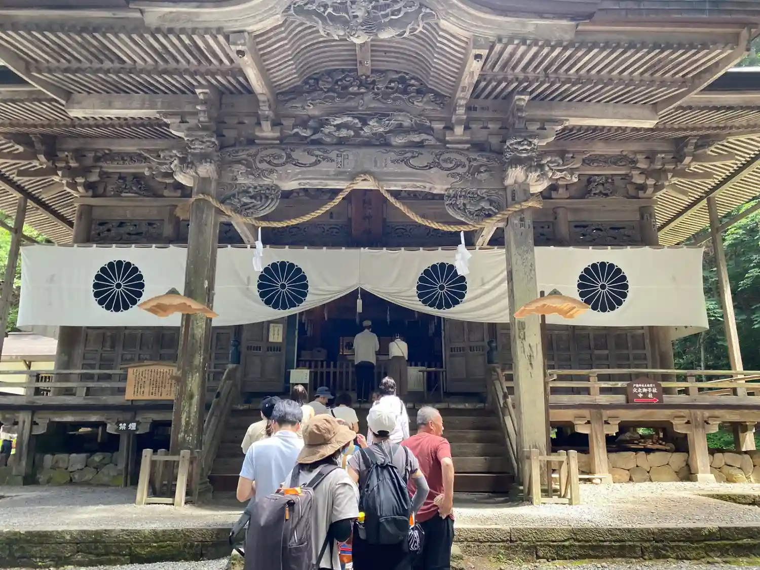 戸隠神社五社巡り。最初に参拝した御社殿は「宝光社」です。白地に菊の紋が描かれている幕が掲げられ「戸…