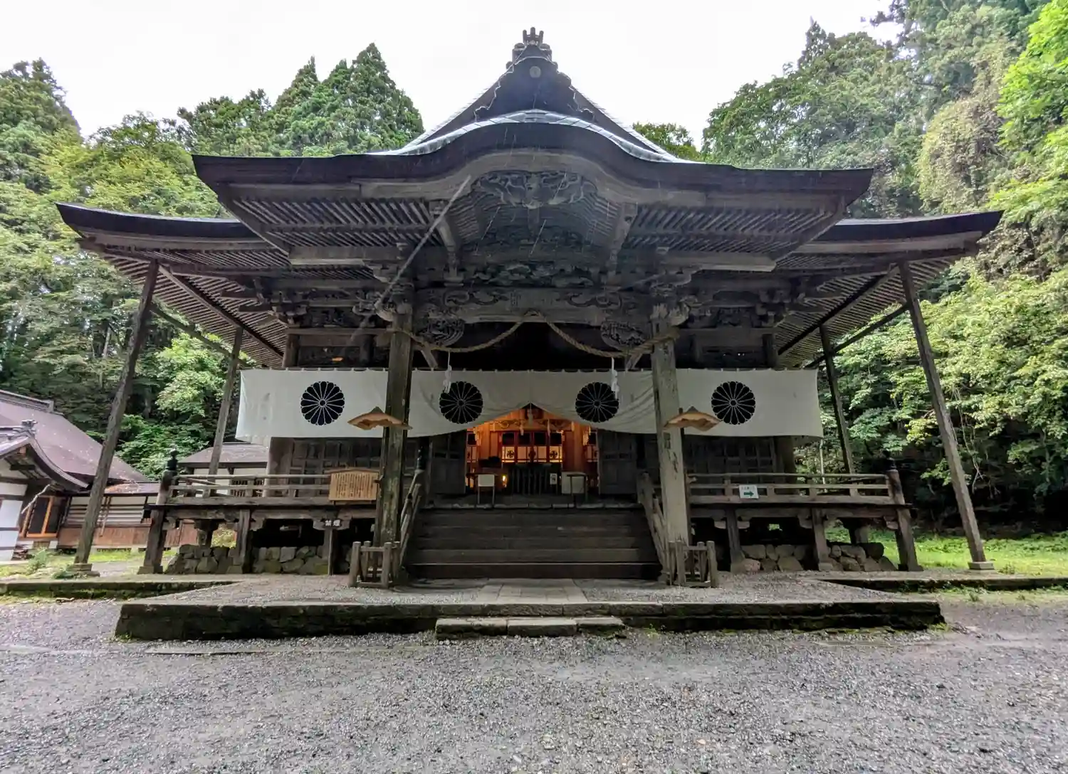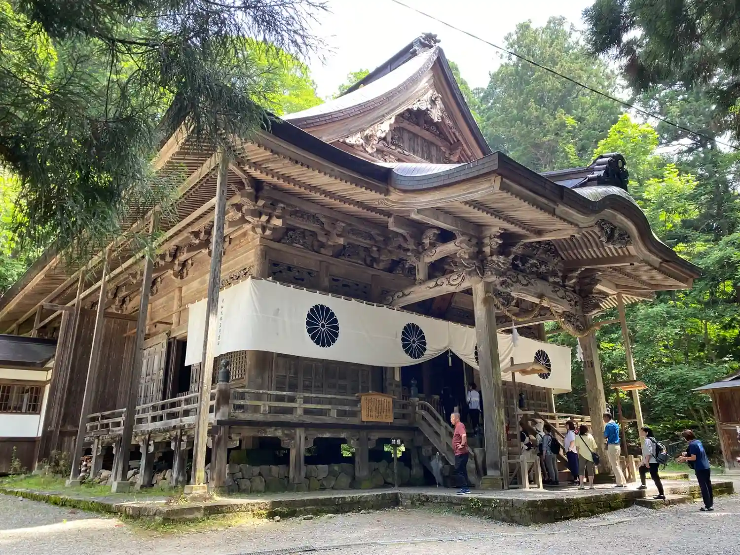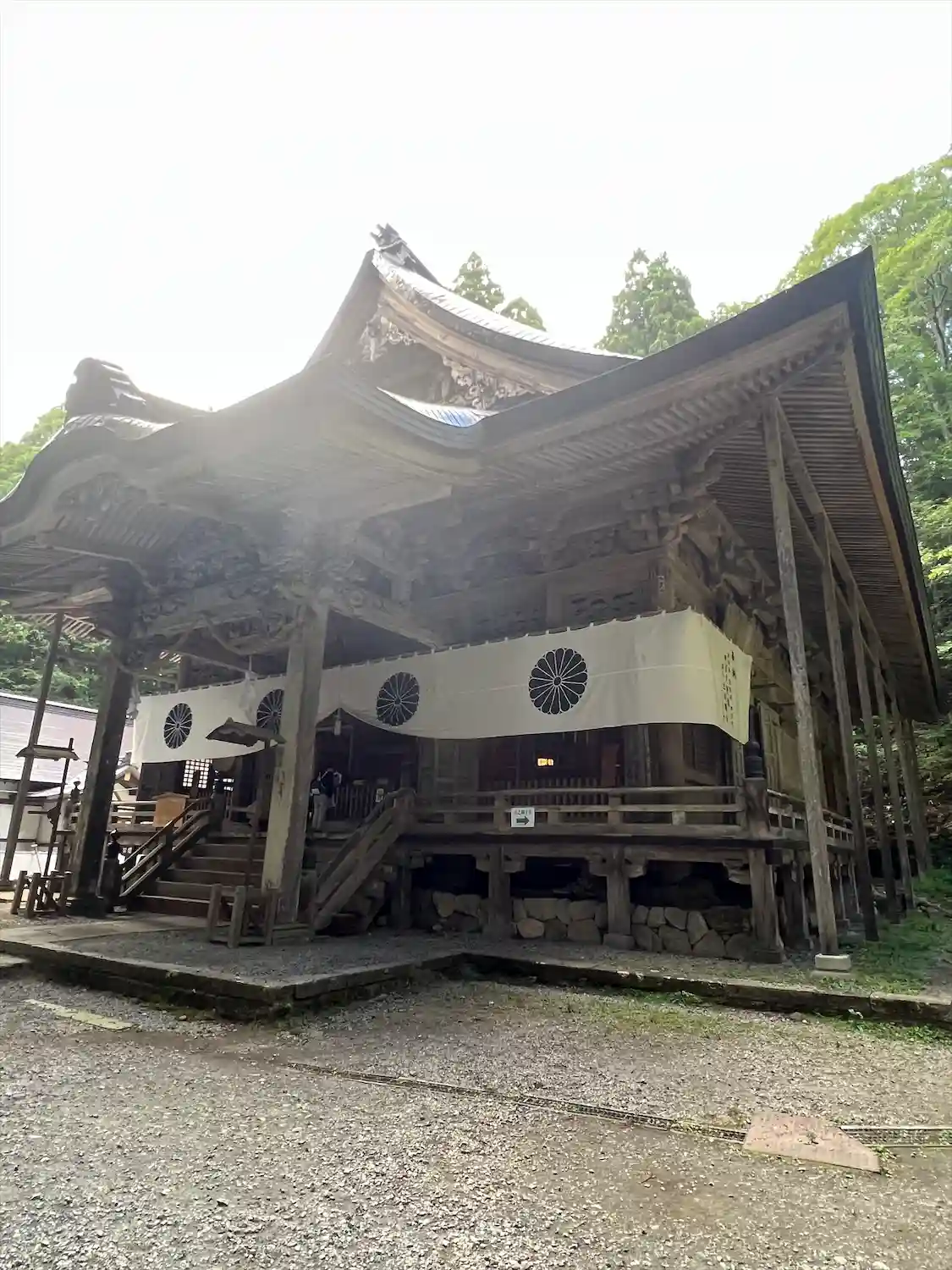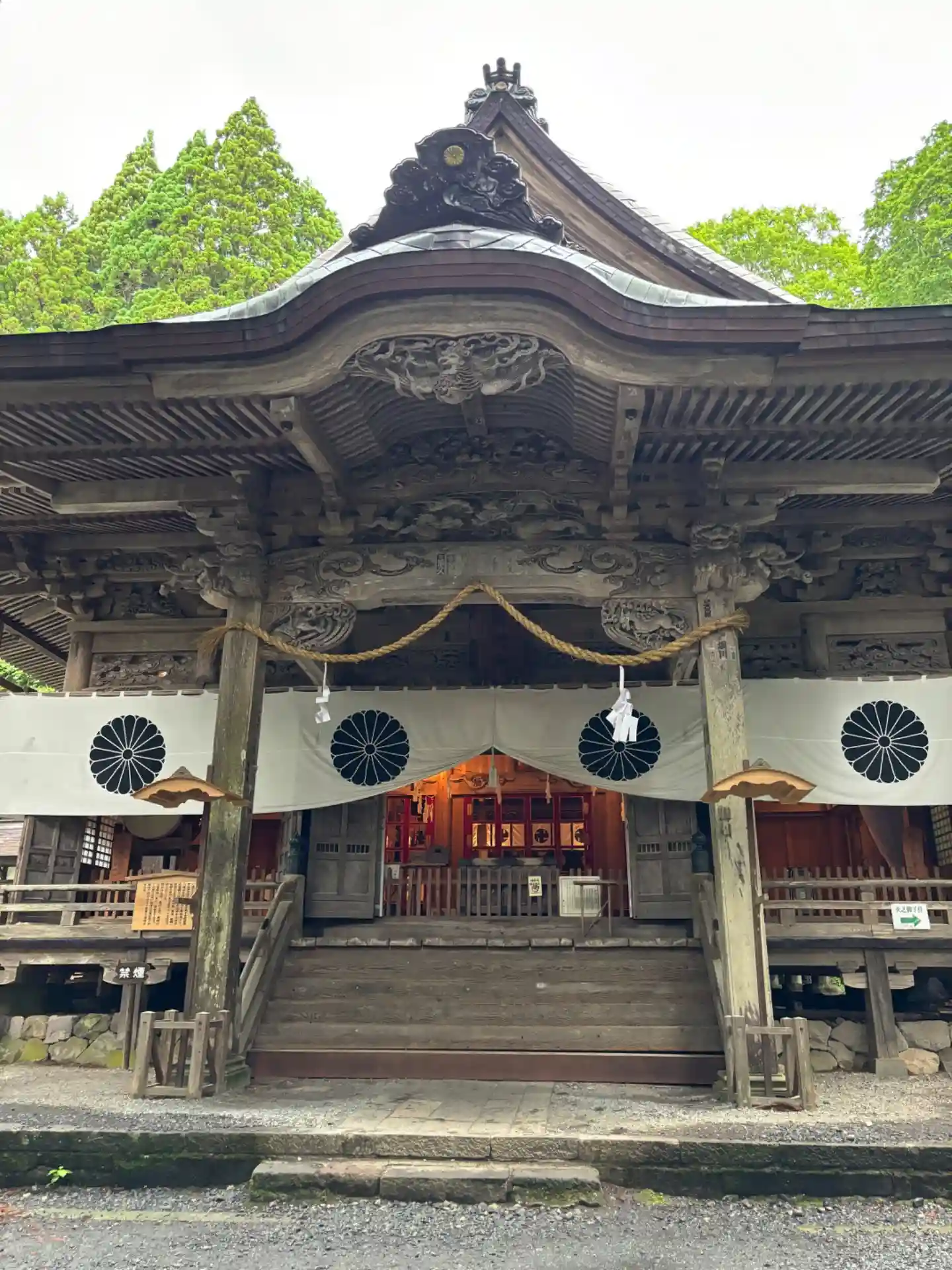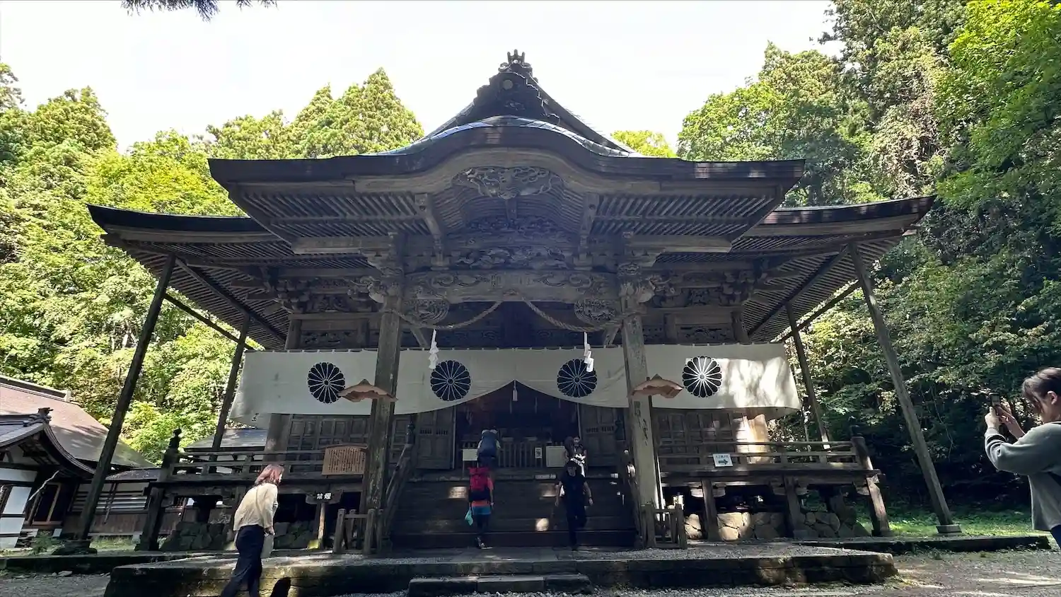 戸隠神社五社巡り。最初に参拝した御社殿は「宝光社」です。白地に菊の紋が描かれている幕が掲げられ「戸…