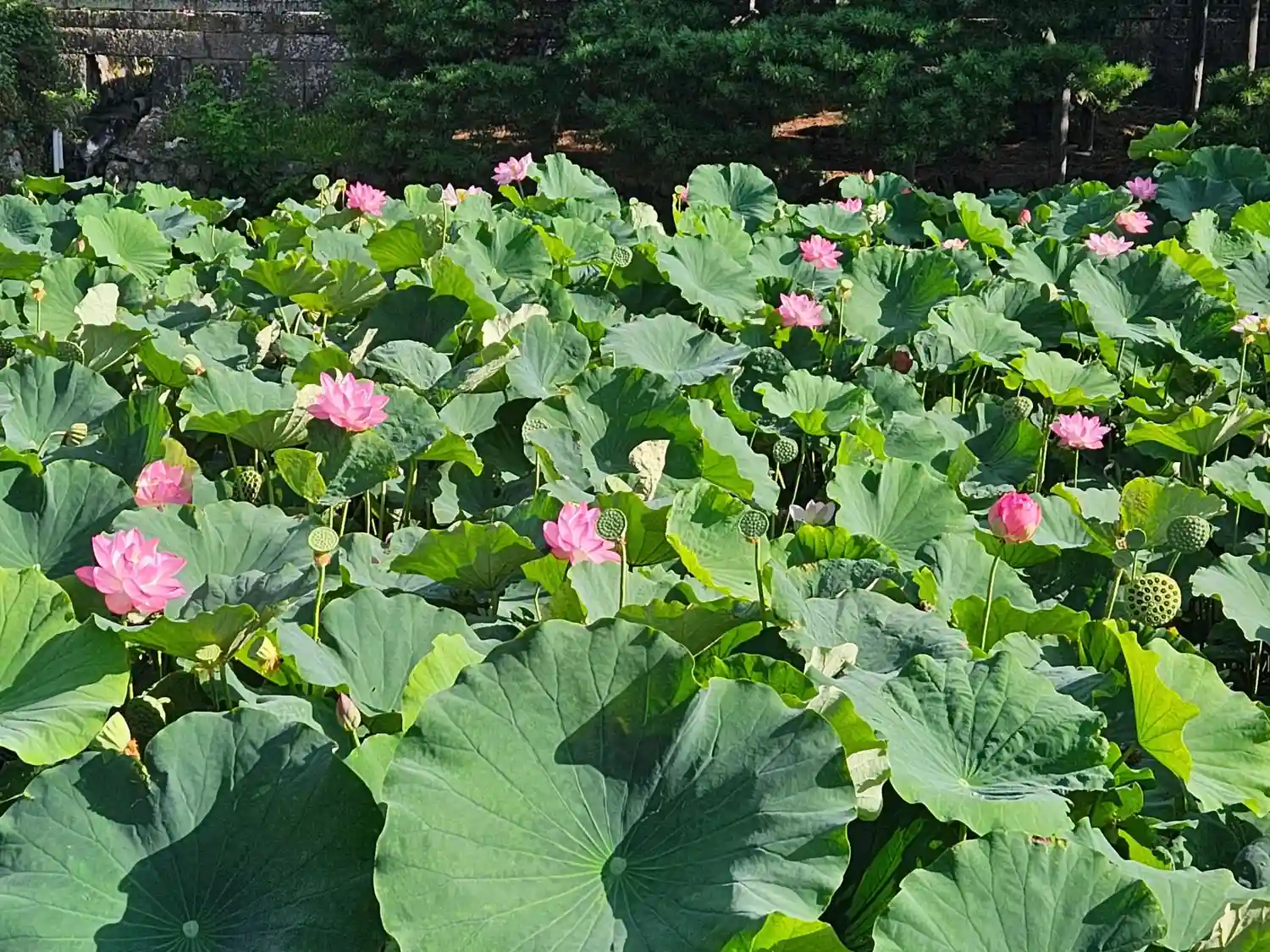 放生池は江戸時代の天明大飢饉(1783年~1787年)の際に、善光寺蔵米を放出して窮民を救済した第80世・等順大僧正の恩に報いるために民衆が築造したもの。2000年前の種子を発芽させた古代ハスが咲く。