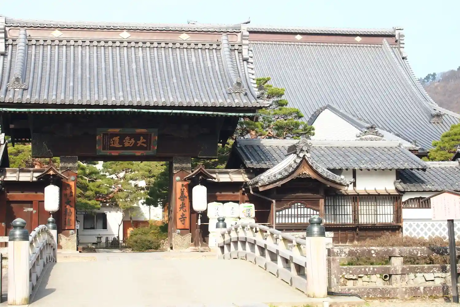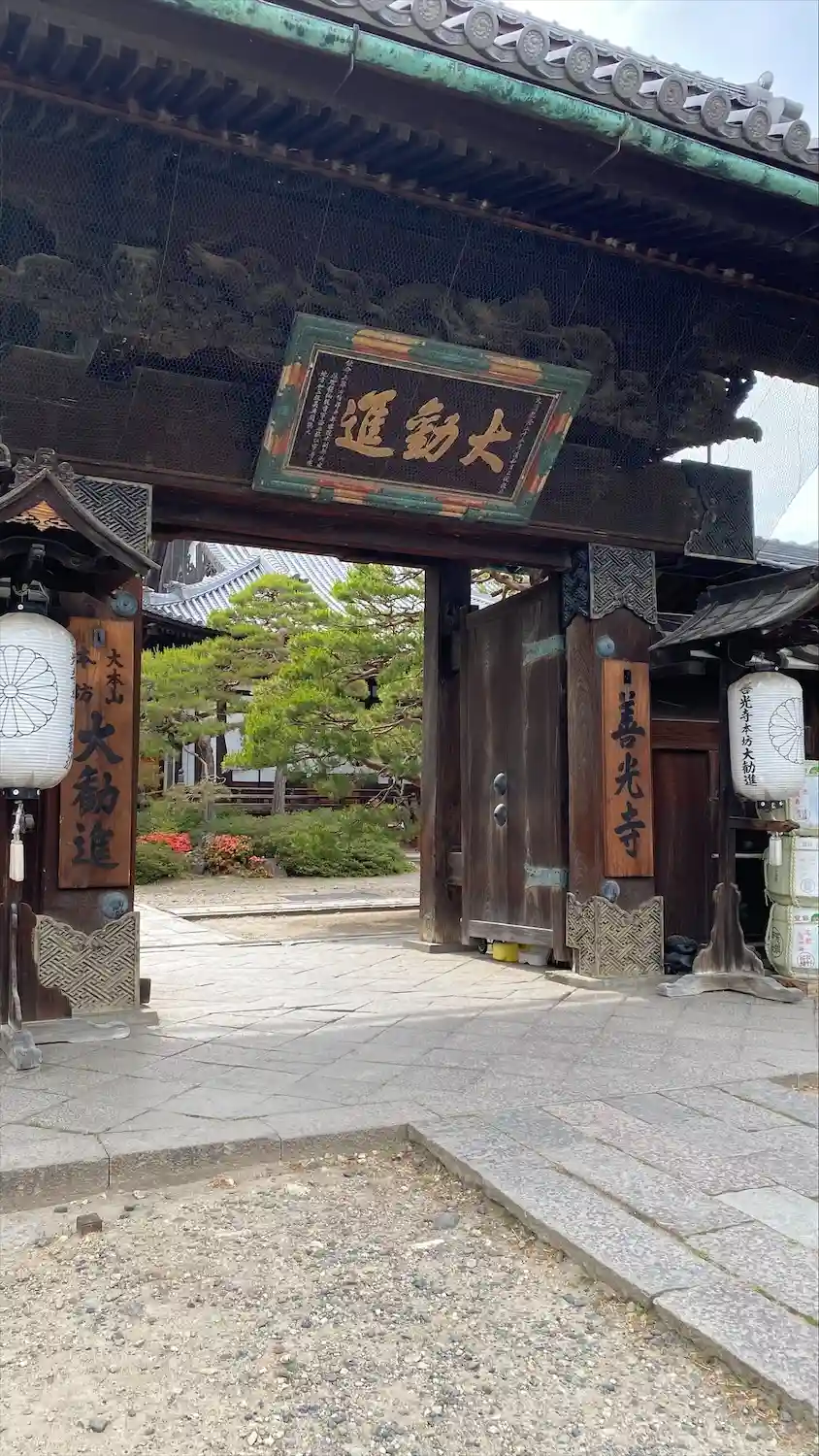 左右の表札には「善光寺」、「大本山 本坊 大勧進」とある。