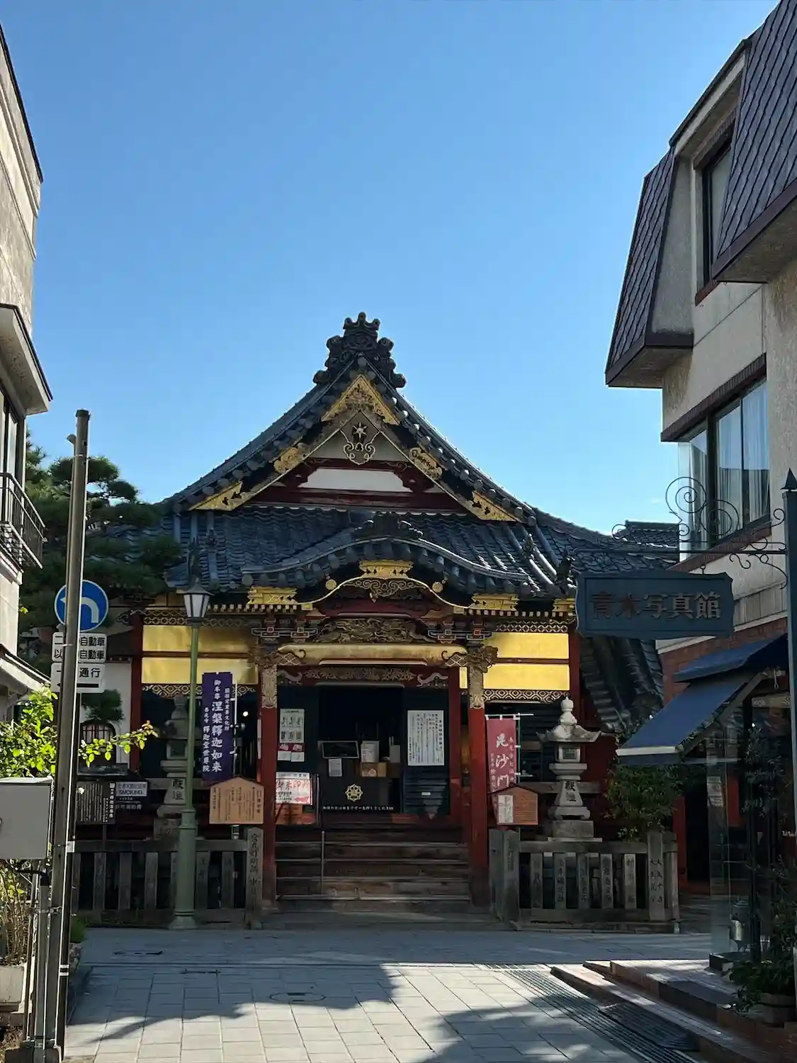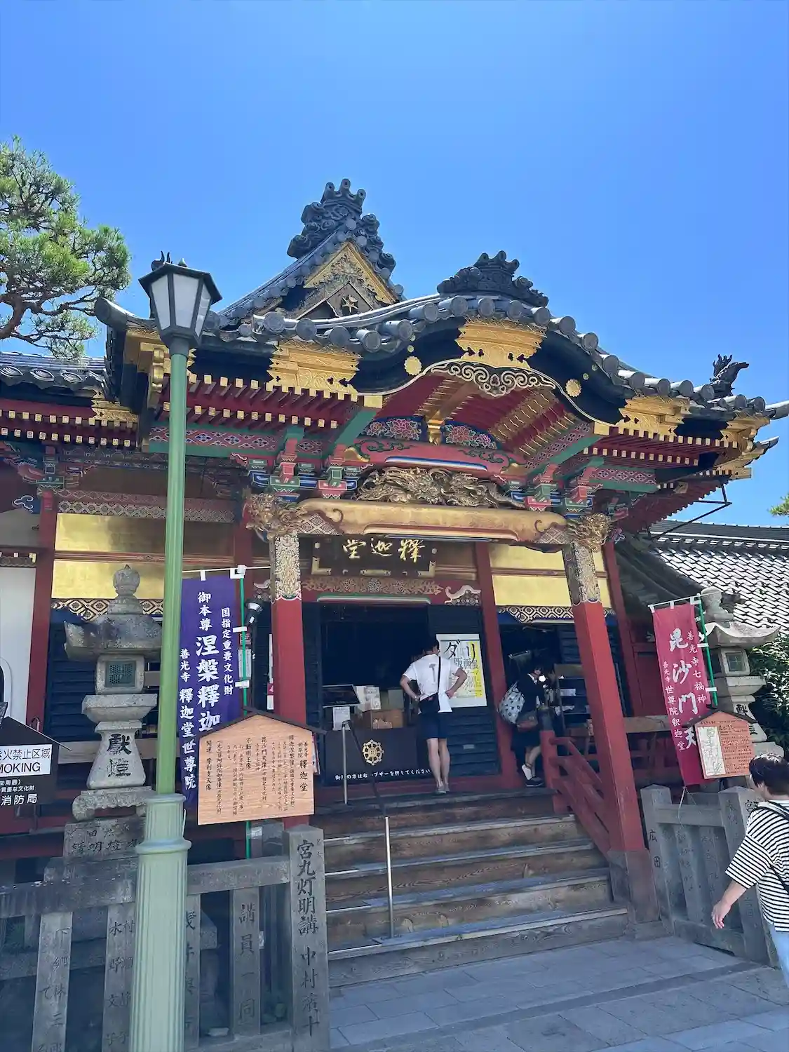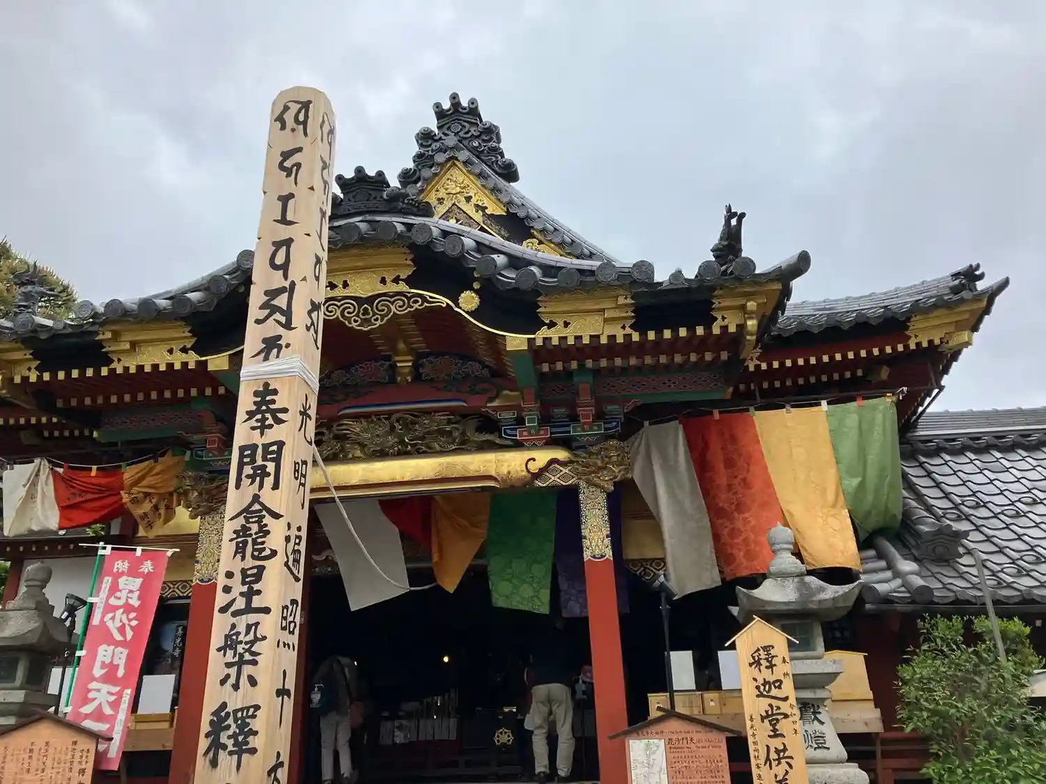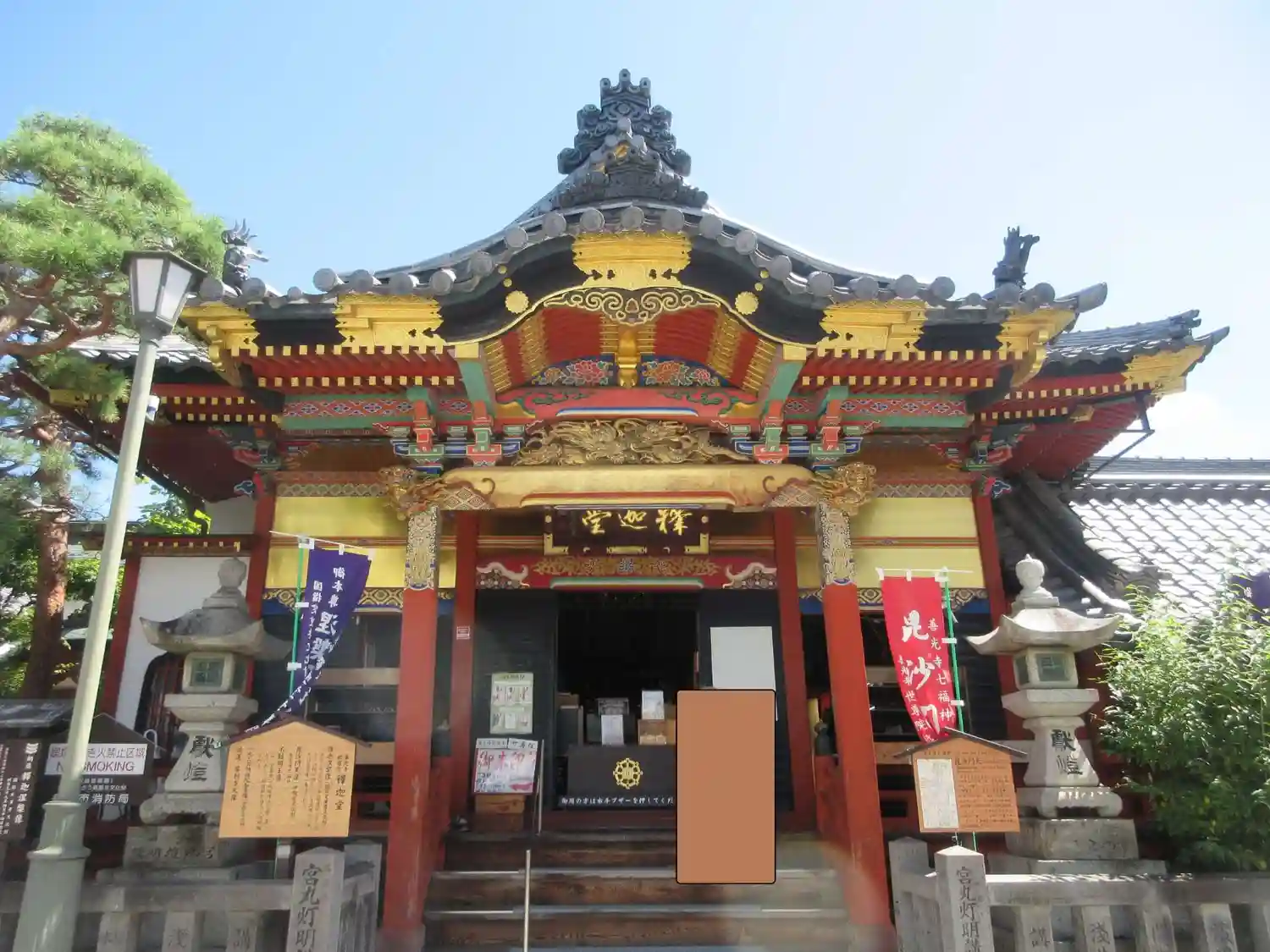 仲見世通りを脇道から煌びやかな寺院が見えます世尊院釈迦堂へ。本殿内の至る所に…
