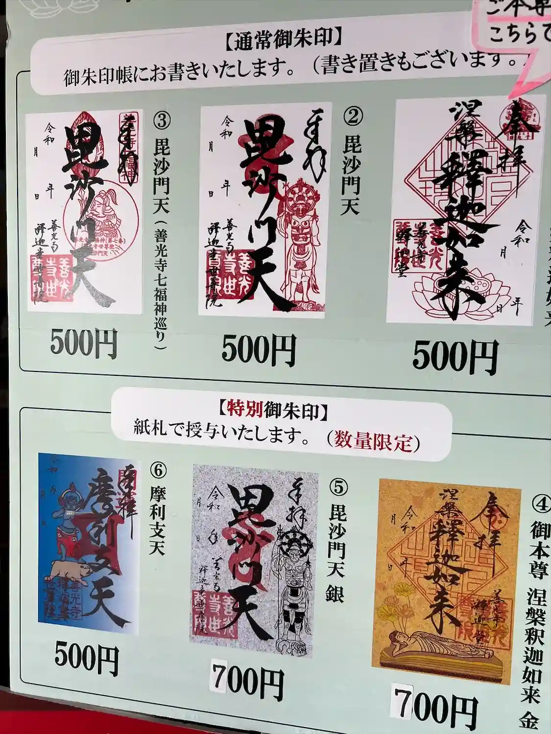 善光寺七福神の毘沙門天の御朱印を直書きでいただきました。