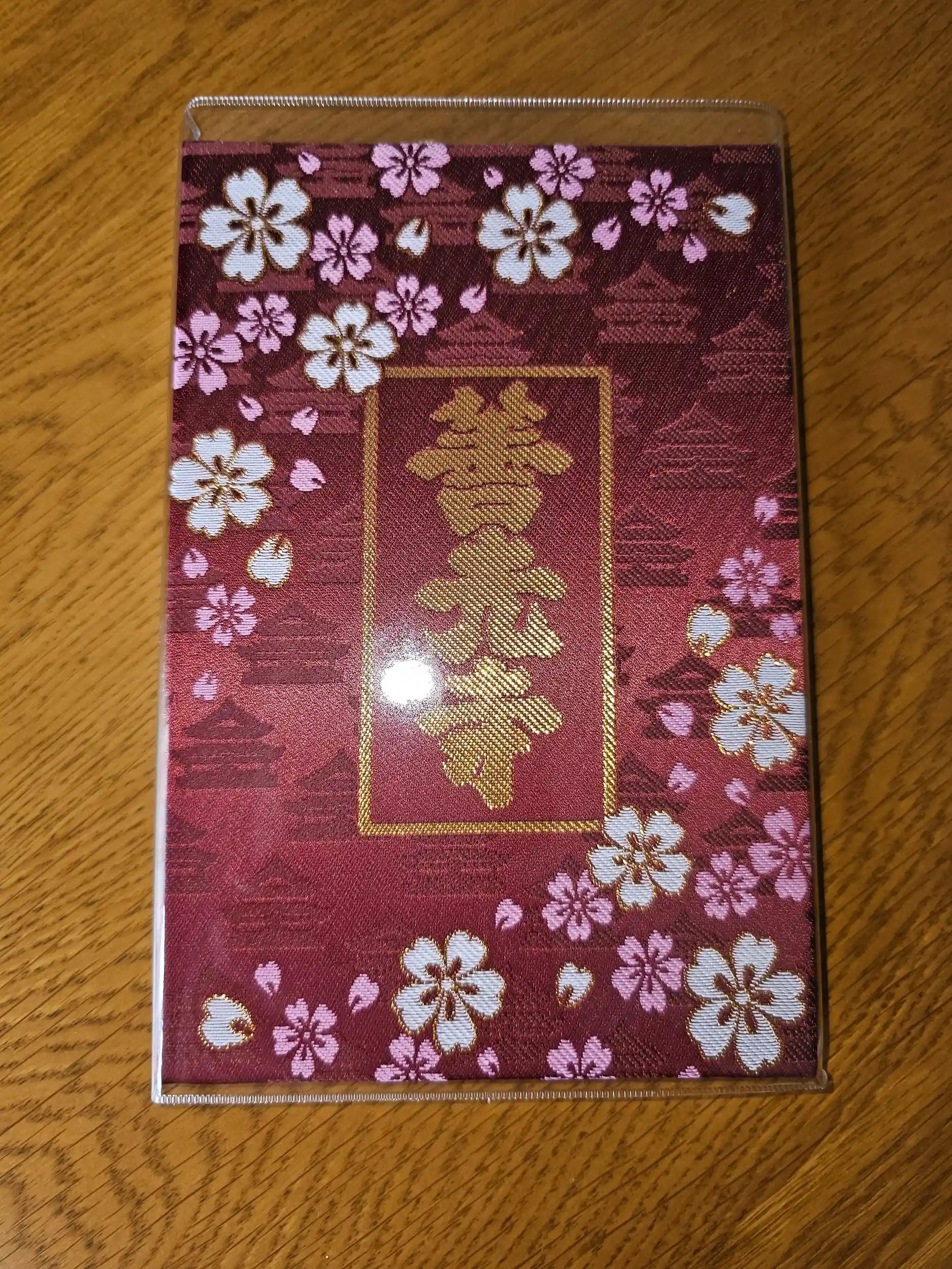表紙に善光寺さんの名入りで、えんじ色な落ち着いた桜柄のデザインの綺麗な御朱印帳です。