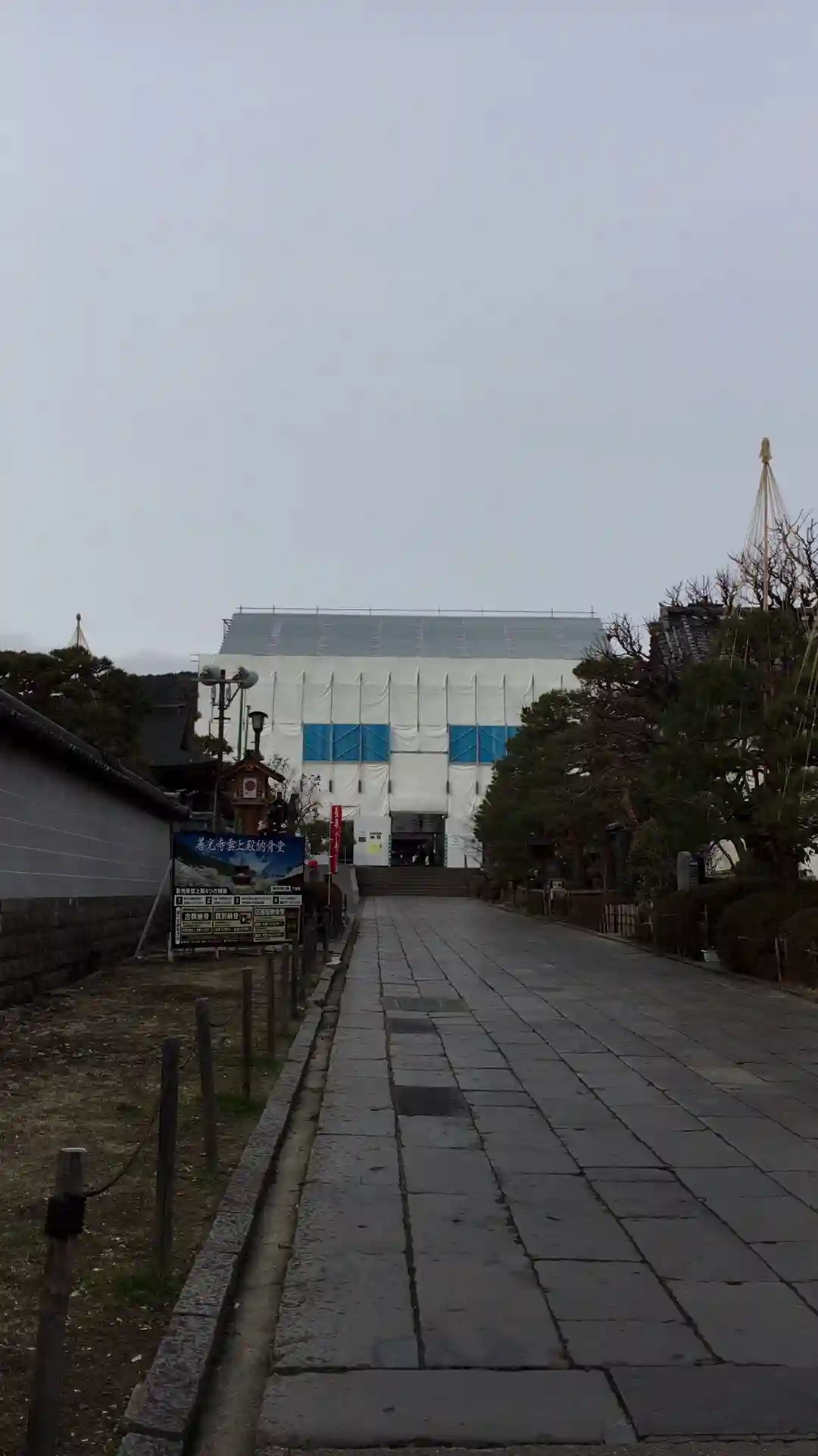 参道です。左に大本願、右に宿坊が建ち並びます。奥に見えるのが仁王門。只今改修工事中となります。