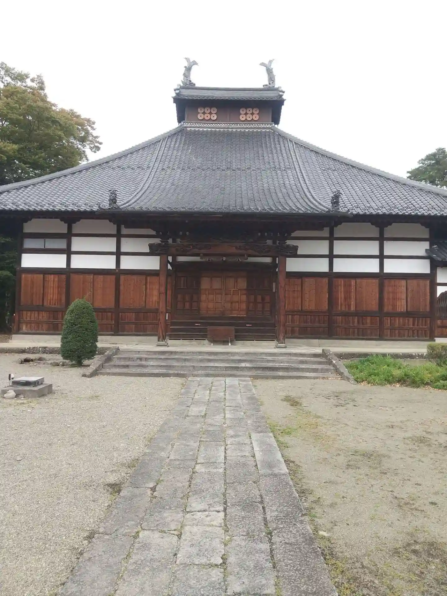本堂外観です。屋根の上に六文銭。
