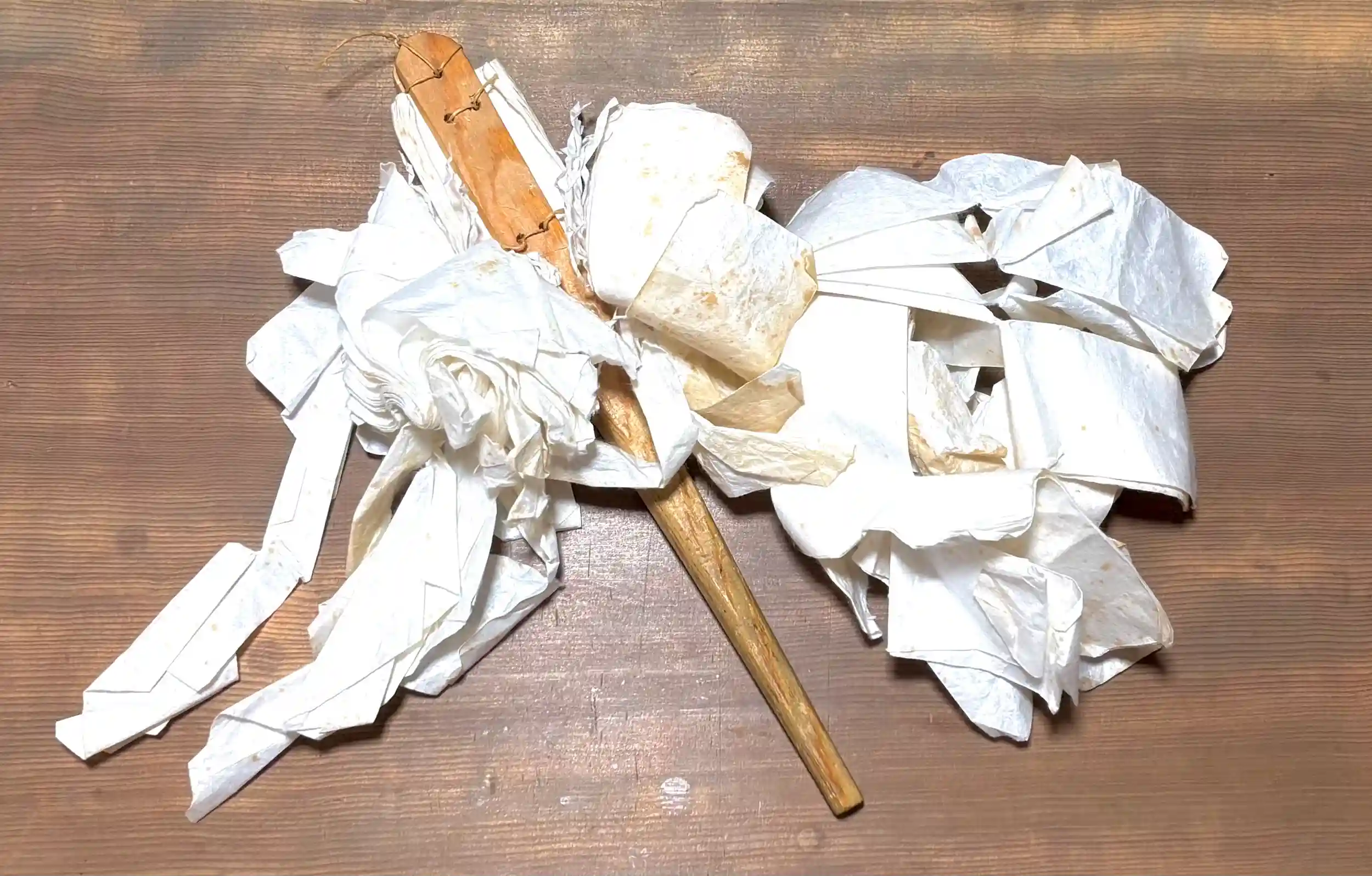 年季の入った御幣を新しくします。初めてお預かりしたものなので、じっくり作りを観察中。不安と好奇心とを胸に取り掛かります!