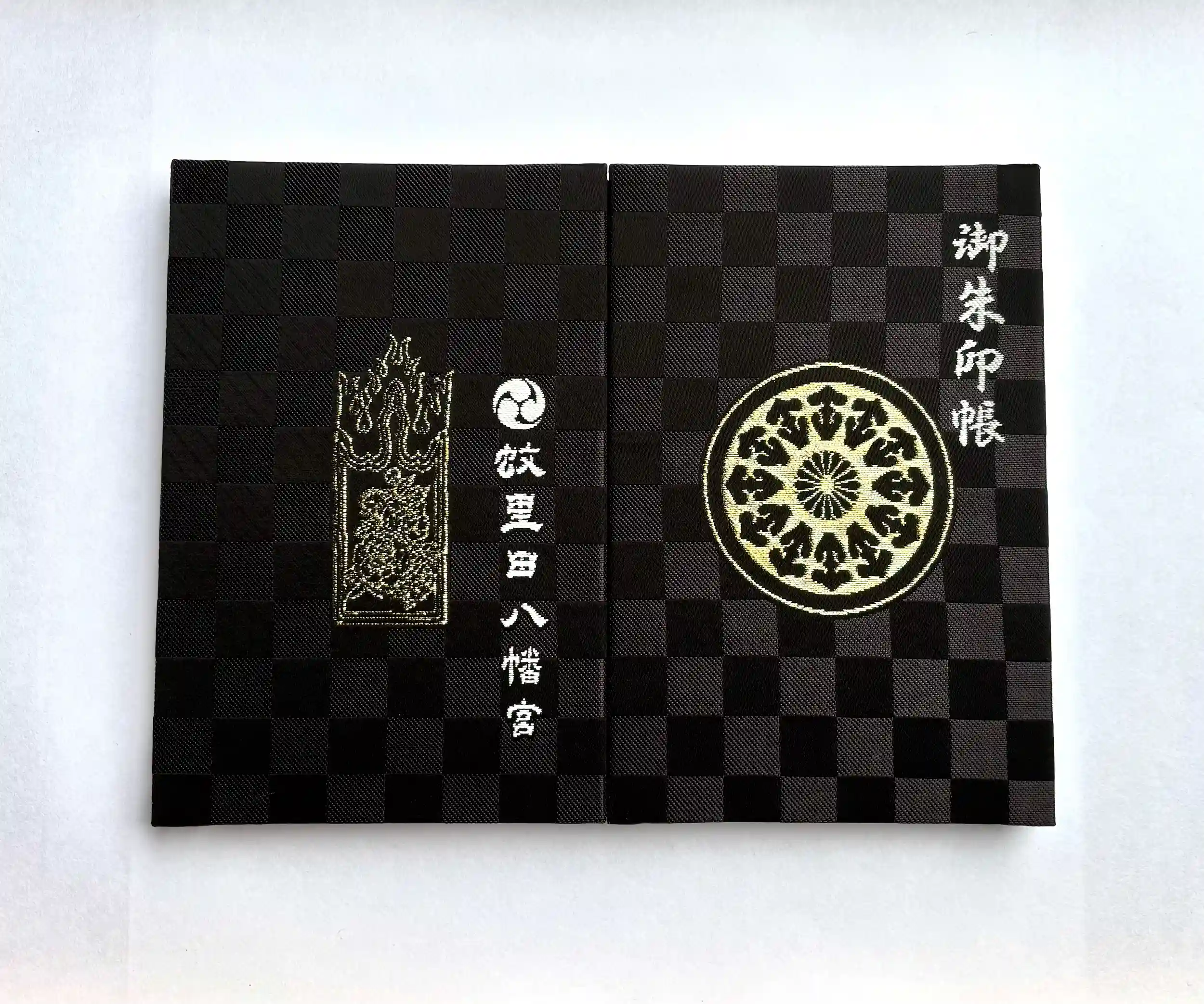 従来の御朱印帳(青・11cm×16cm)に追加して、いわゆる大判サイズ(黒・12cm×18cm)をご用意いたしました。色は従来のものが青色、大判サイズは黒色となります。