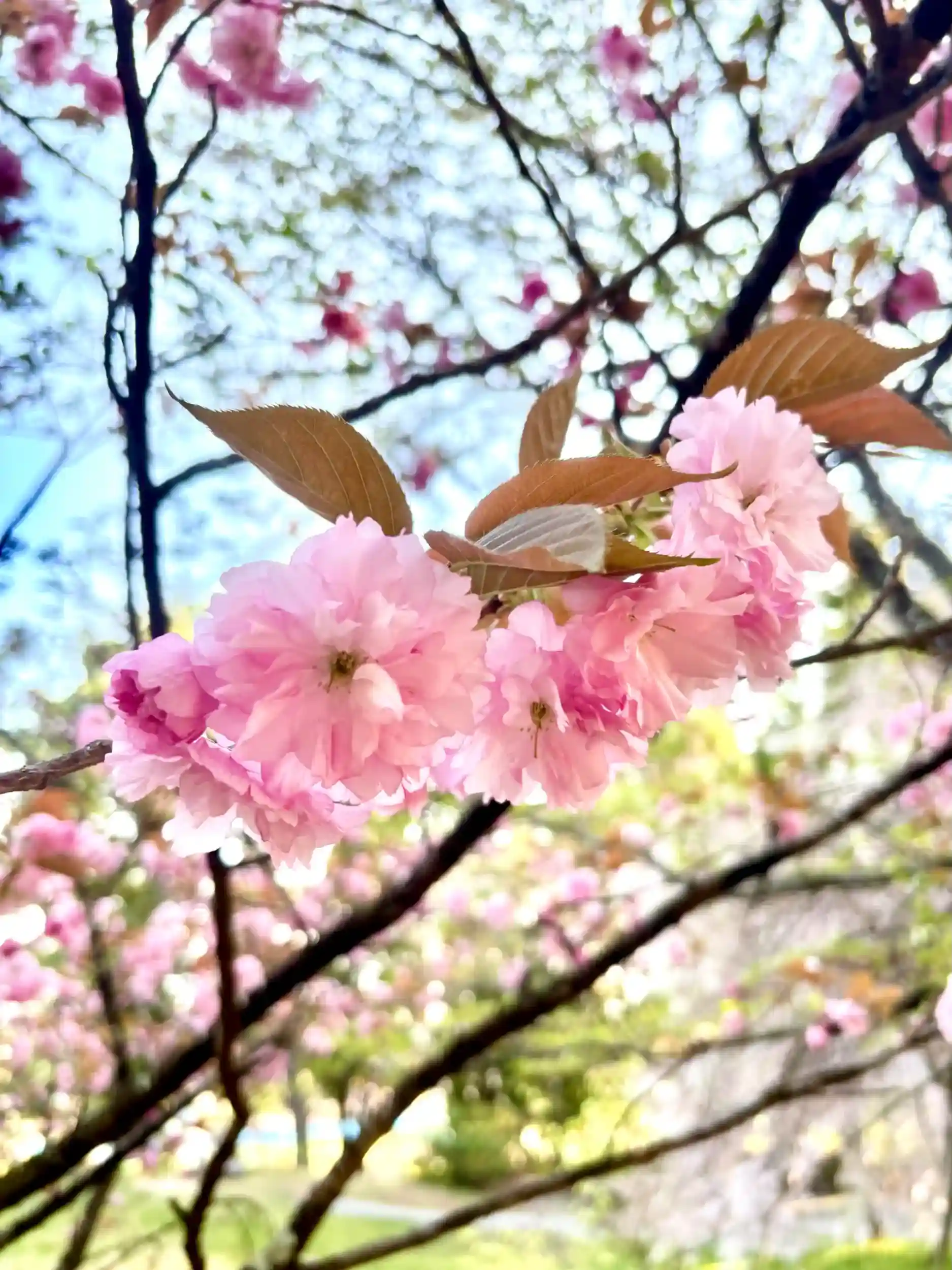 境内では桜の主役が八重咲きにかわりました。八重桜と、やわらかな黄色が印象的な鬱金(ウコン)桜です。