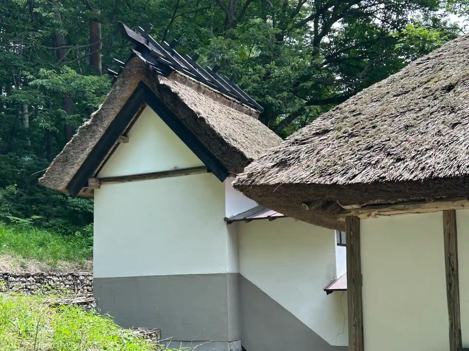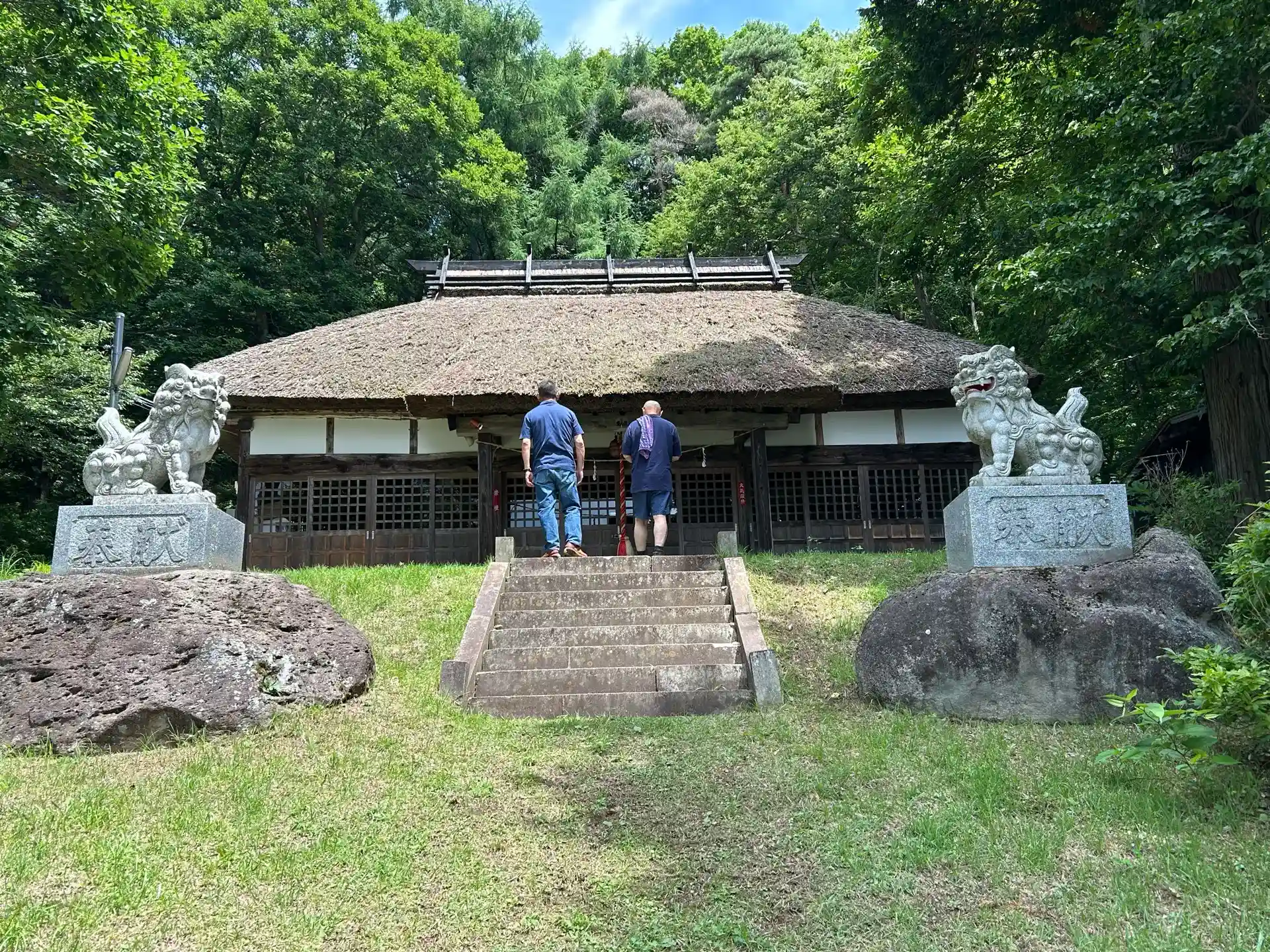 傾斜地に茅葺き屋根の社殿が落ち着いた雰囲気を醸し出していました。