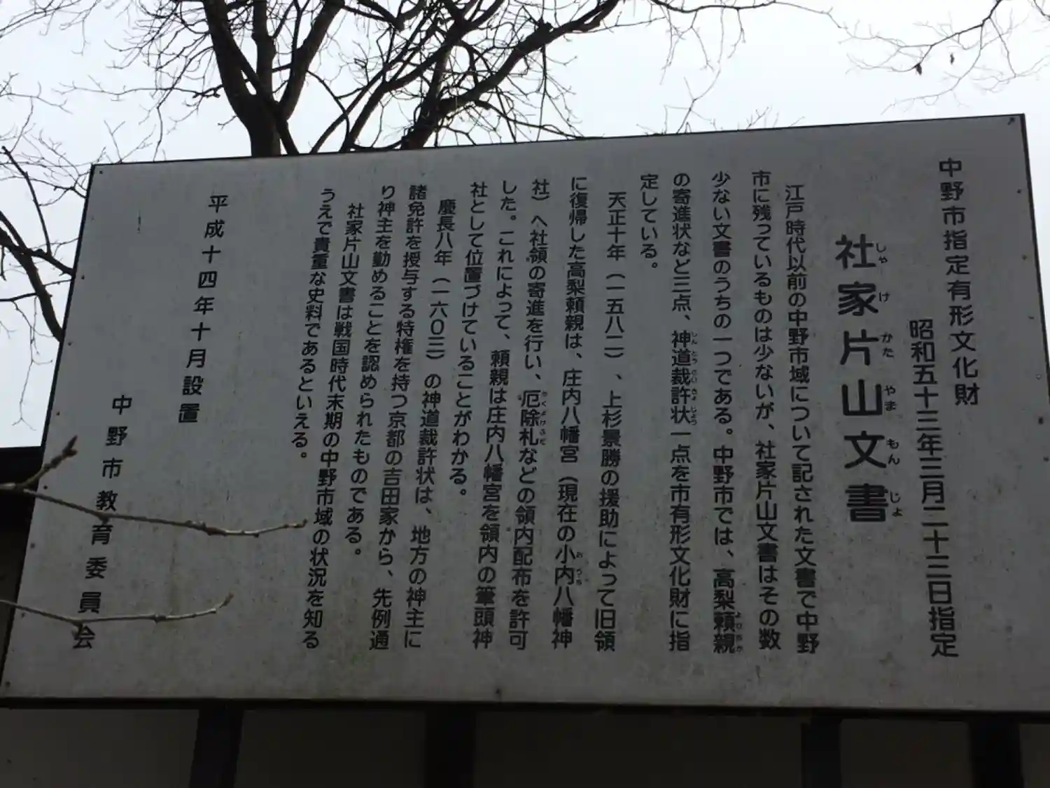 中野市指定有形文化財「片山文書」説明文