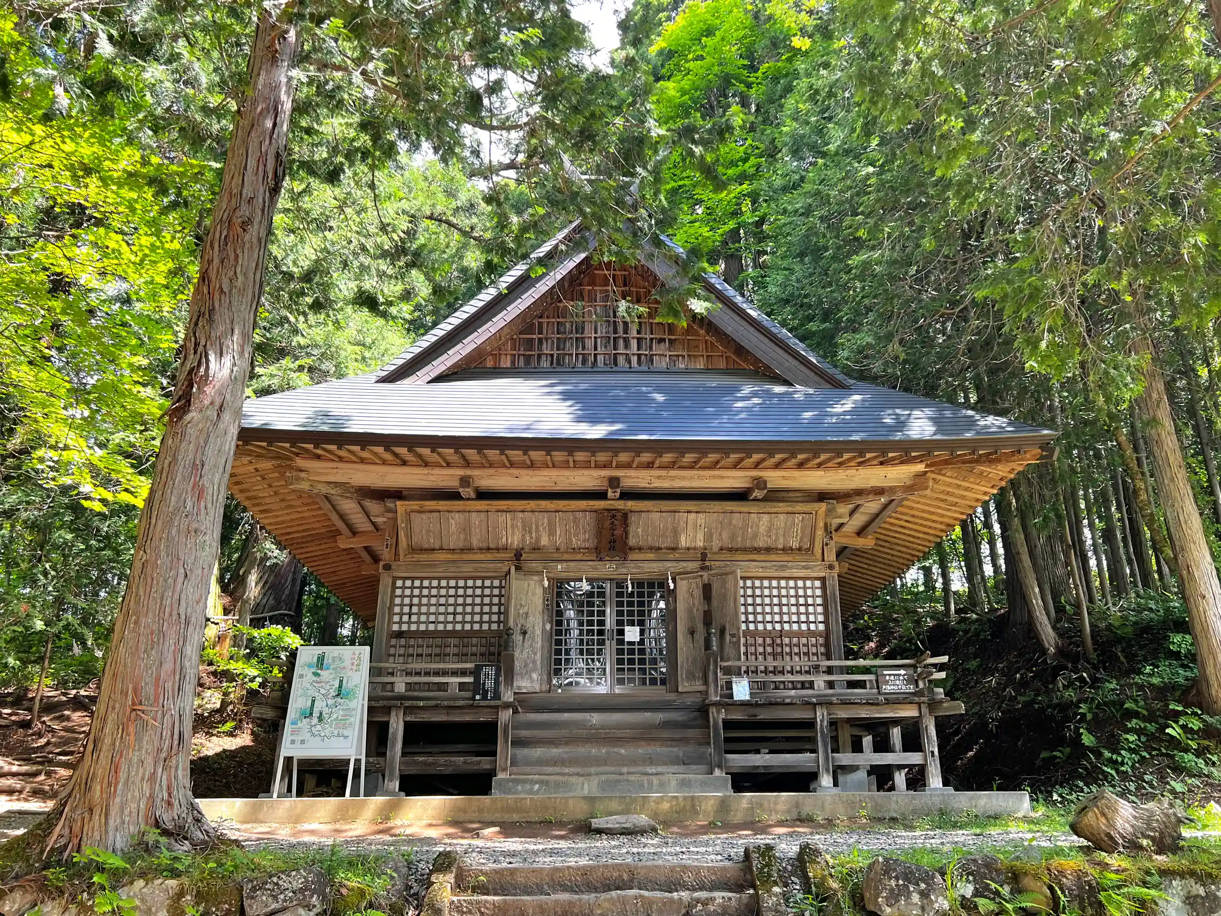 階段を登ると、巨木の間に社殿が見えてくる。