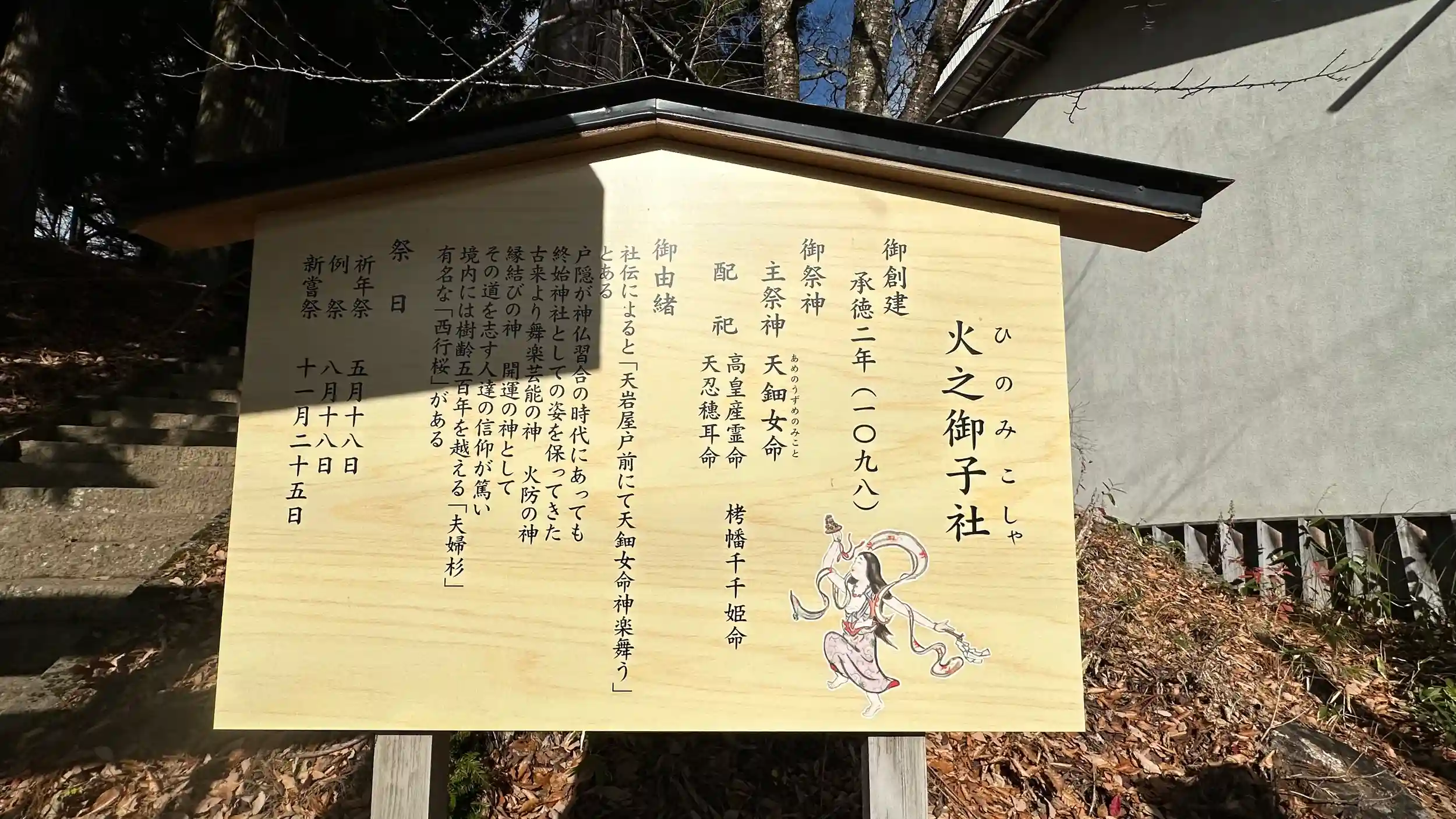 主催神 : 天鈿女命、高皇産霊命、栲幡千々姫命、天忍穂耳命