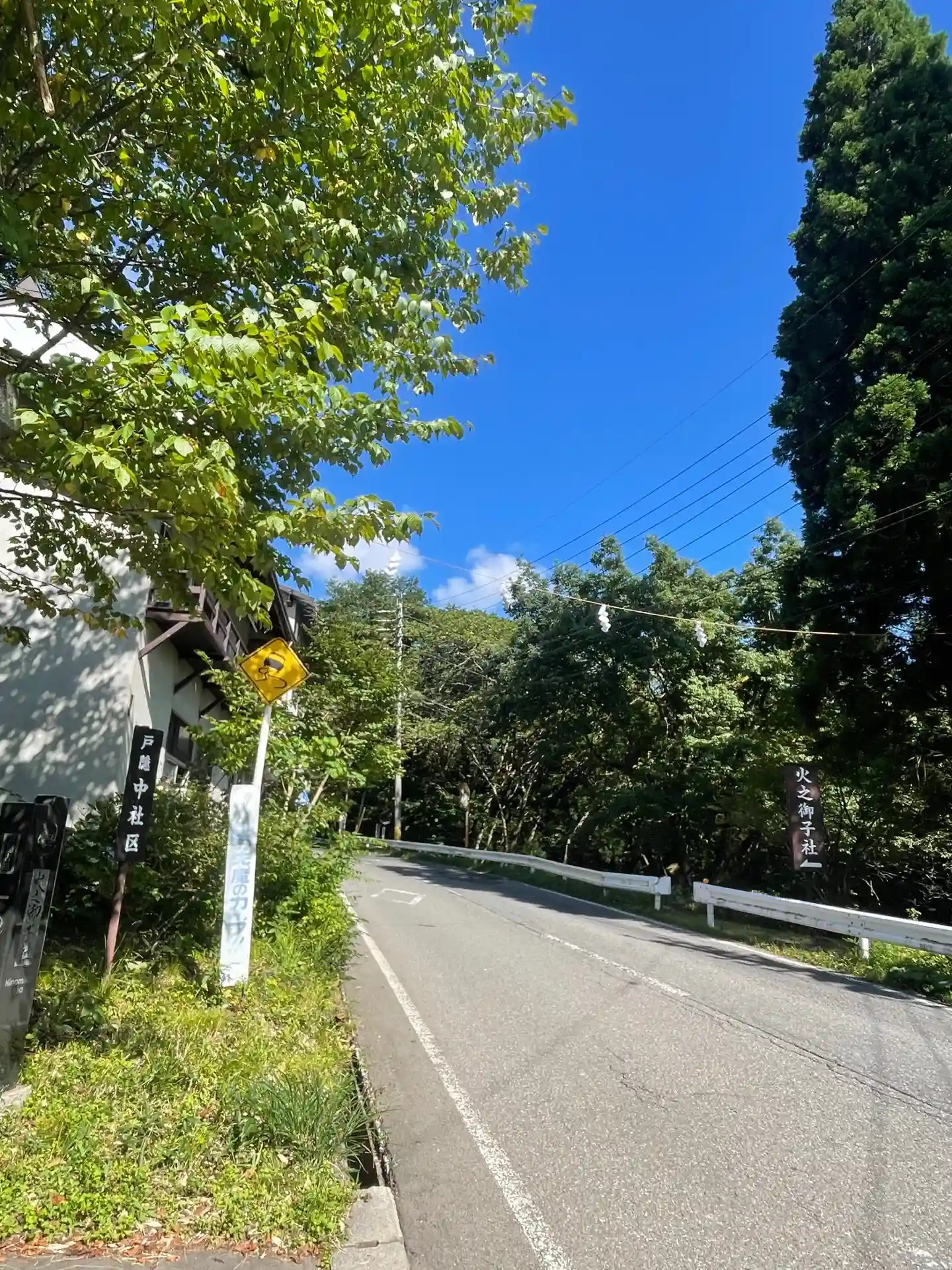 奥社から中社まで戻り神道を通って火之御子社へ。途中熊注意の看板と熊ベルがあり少し緊張しながら向かい…