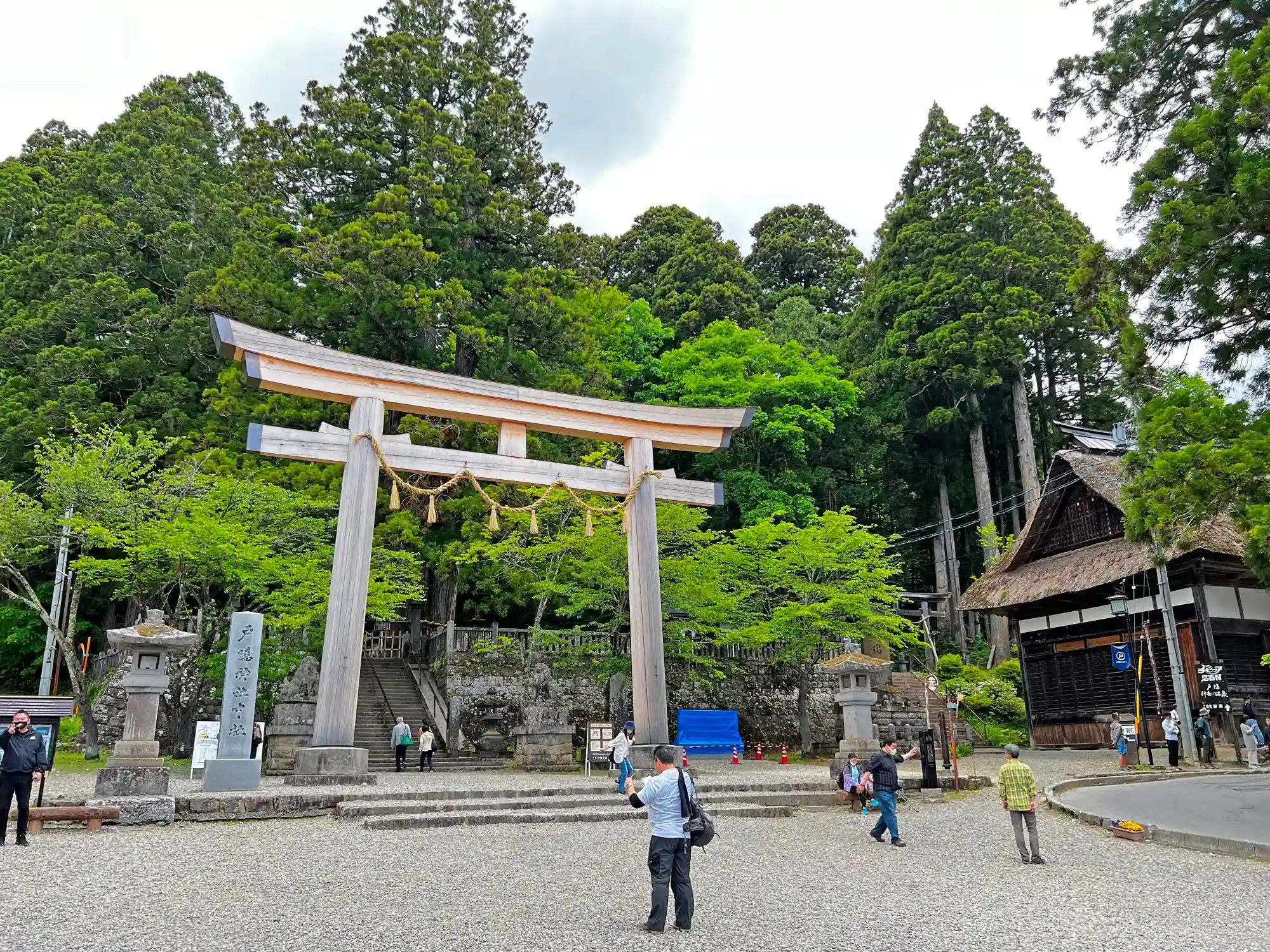 戸隠神社・中社の境内南端入口。写真右端の藁葺屋根が<五斎神社>の拝殿。