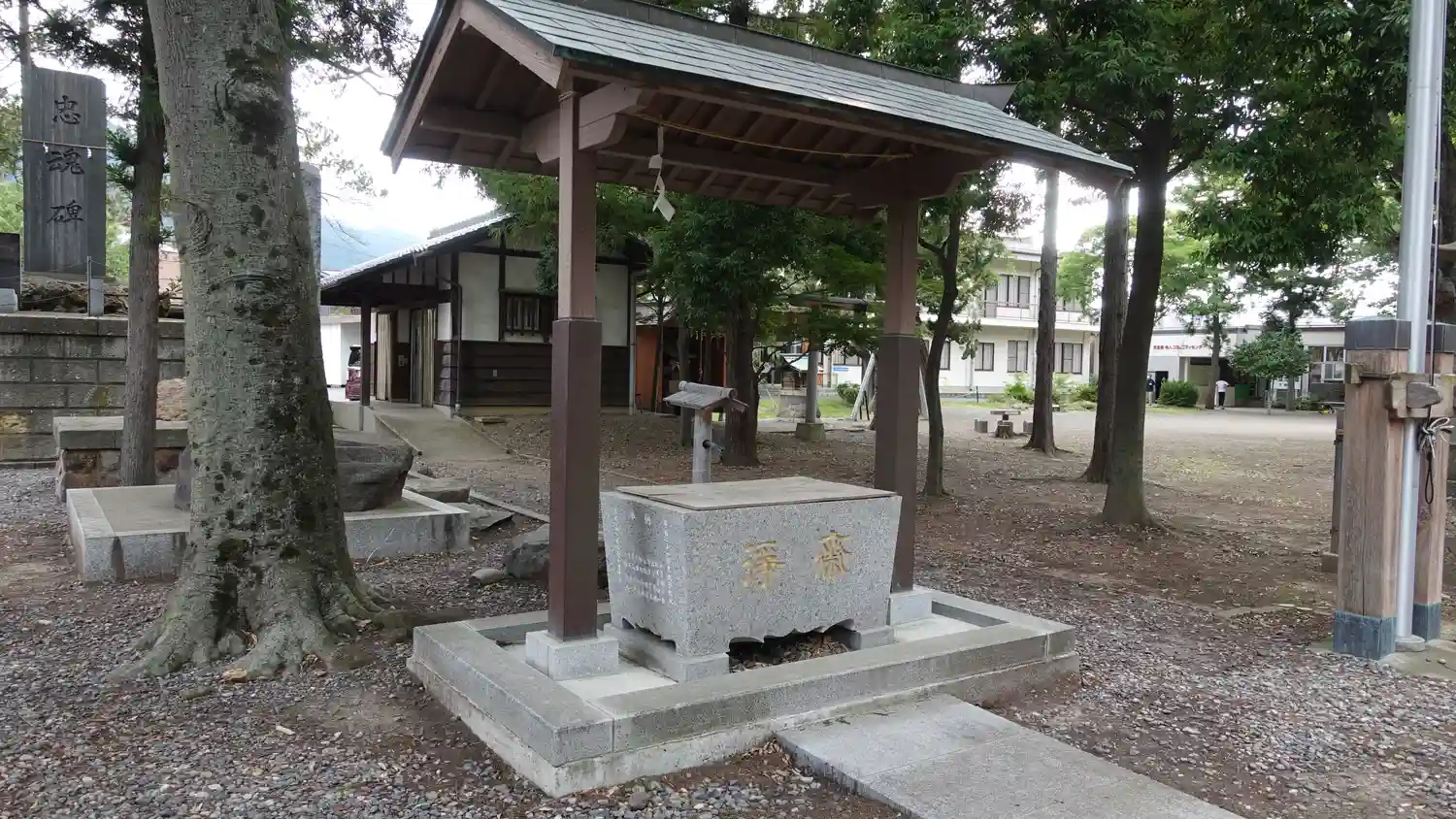 手水舎の後ろにある石碑群。左から順に<忠魂碑>、<千曲川改修記念碑>、<重要文化財指定記念碑>。