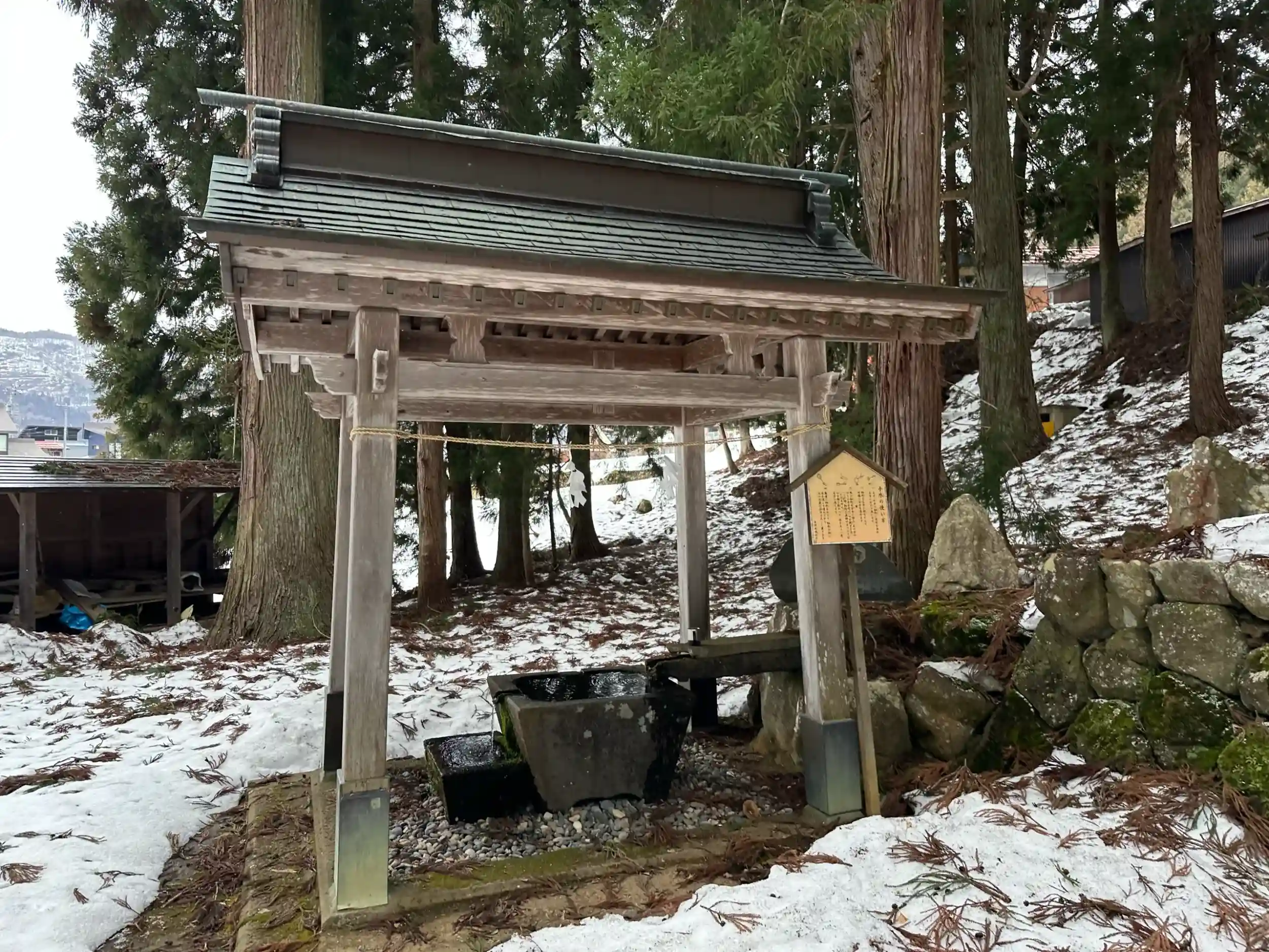 飯山野沢温泉村線の道路を走って野沢温泉村に入った時にまず最初に目に入る神社です。鎮座地の北側に流れる川は赤滝川であり、その上流には赤滝があるため、この滝を御神体とした神社であると思われます。そのため御祭神に対して明記されていませんが、水の神様であると推測されます。