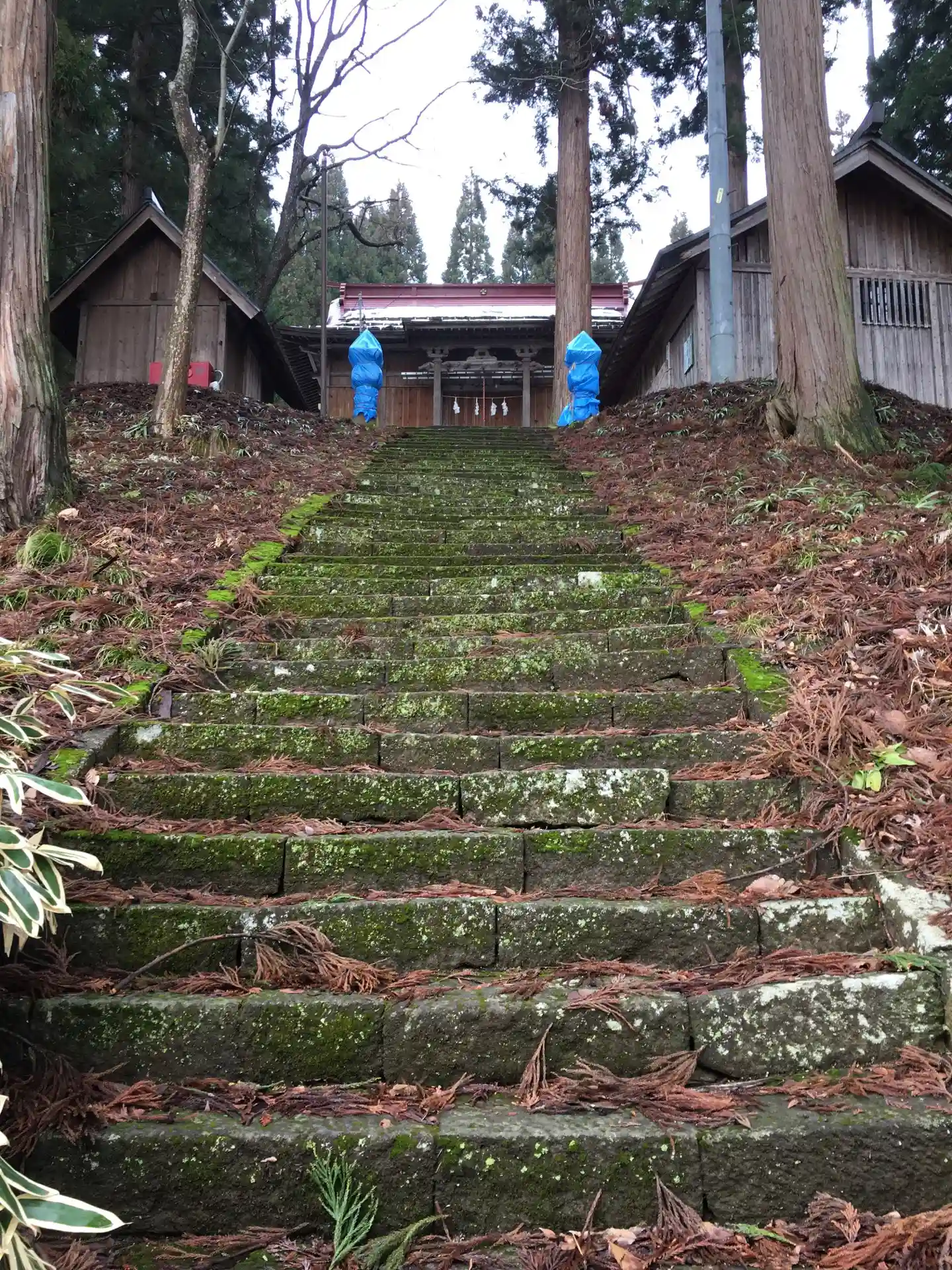 この日は雪が少し積もっていました。重要文化財とされる若宮神社は雪から守るためか保護されていました。