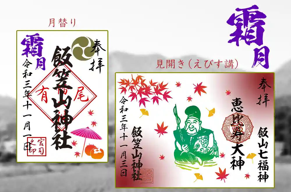 11月の御朱印のご案内です。本来であれば11月3日に商店街を歩行者天国にして行われる「飯山えびす講」を記念した朱印になるはずでしたが、、昨年に引き続き神事のみとなりました。せめて朱印だけでもと美しい紅葉を表現しています。飯山の11月は寒いので温かくしてご参拝ください。