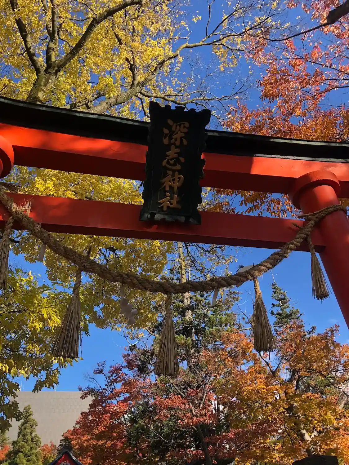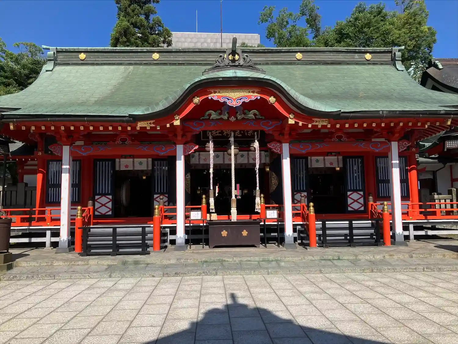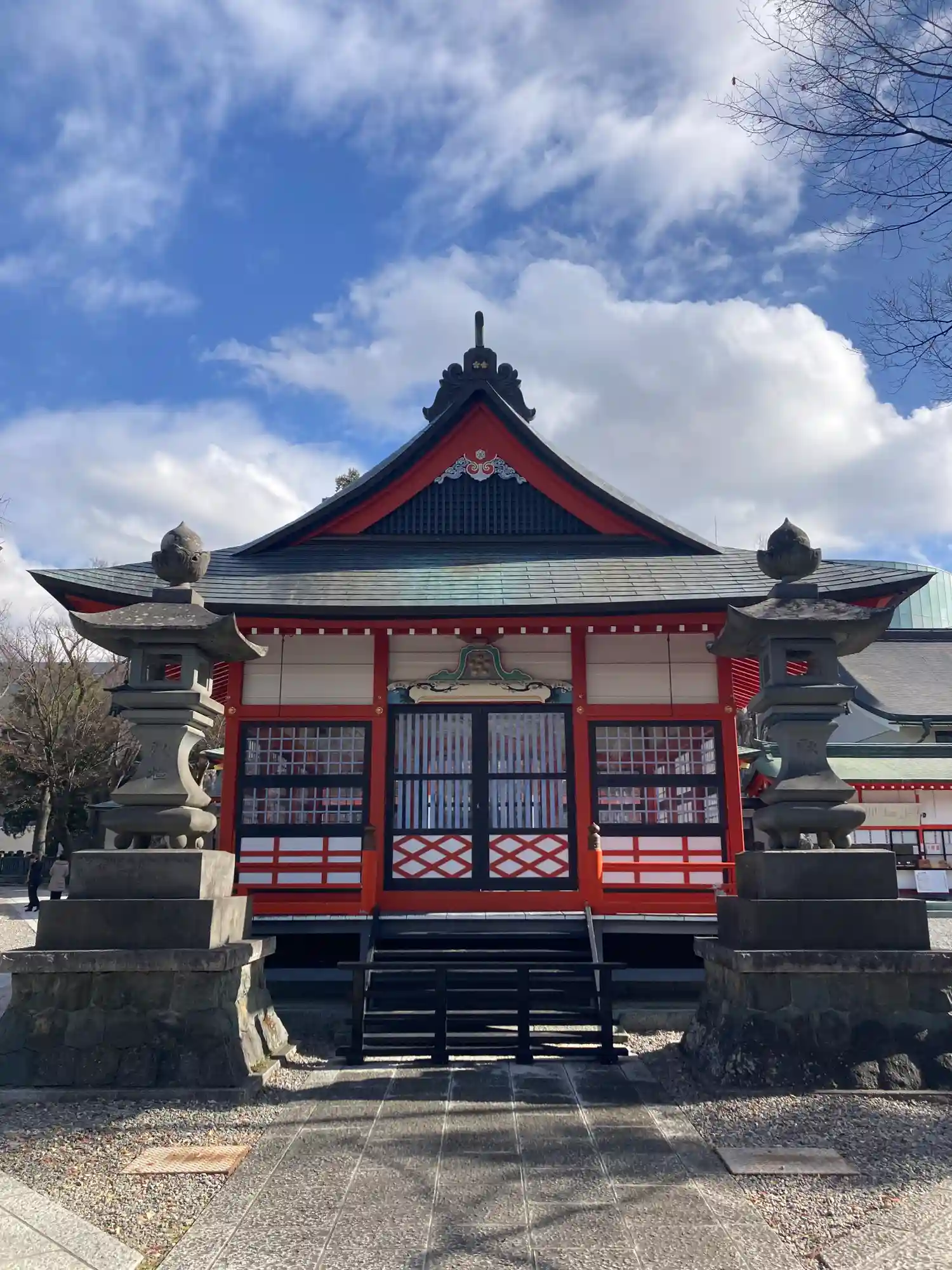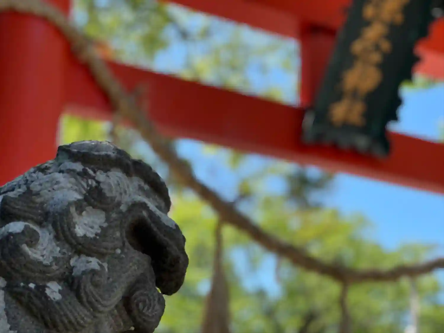 よく晴れた青空に朱い鳥居と社殿が映えます☺️ザワザワと風に気が揺れて気持ちの良いお参りでした^_^…
