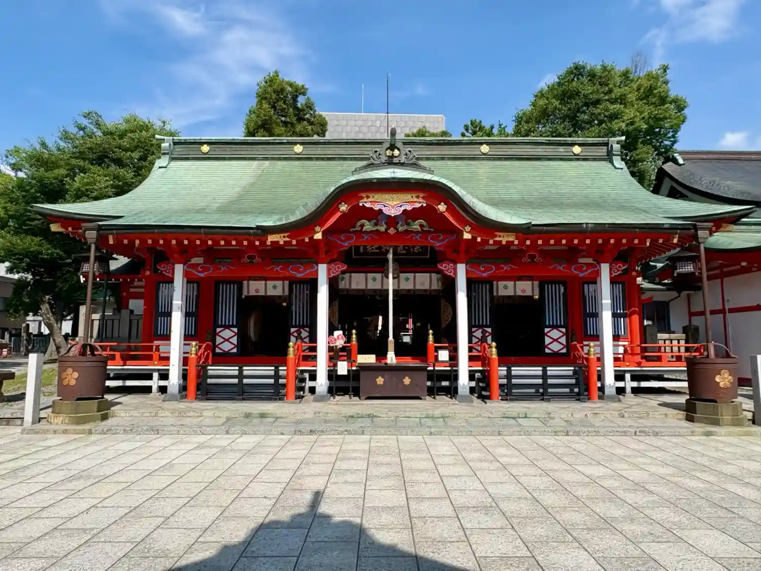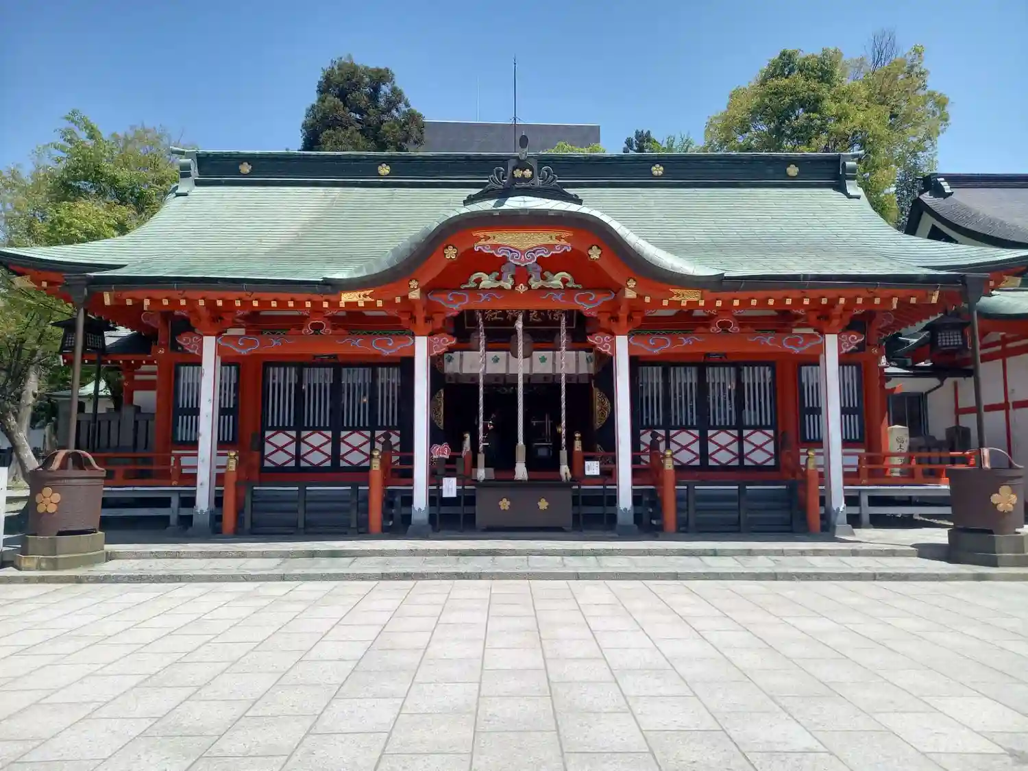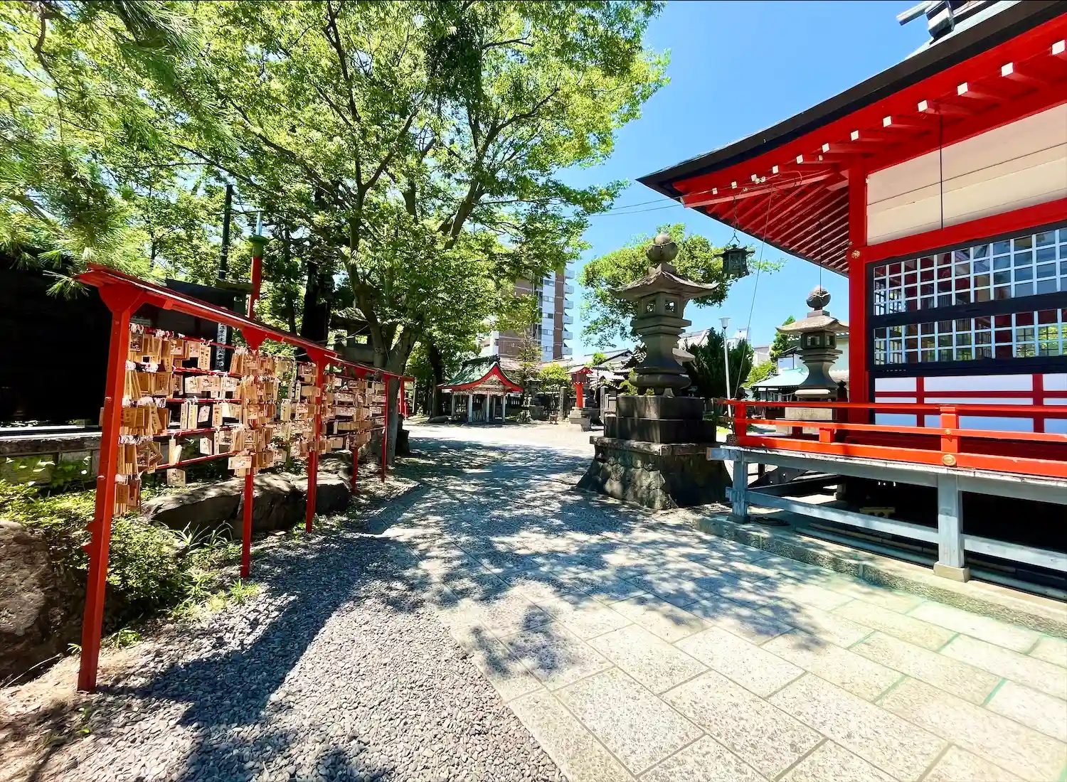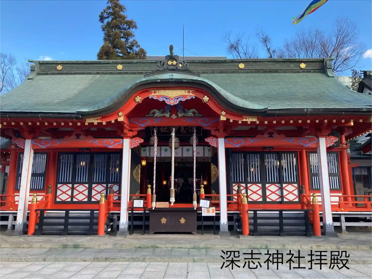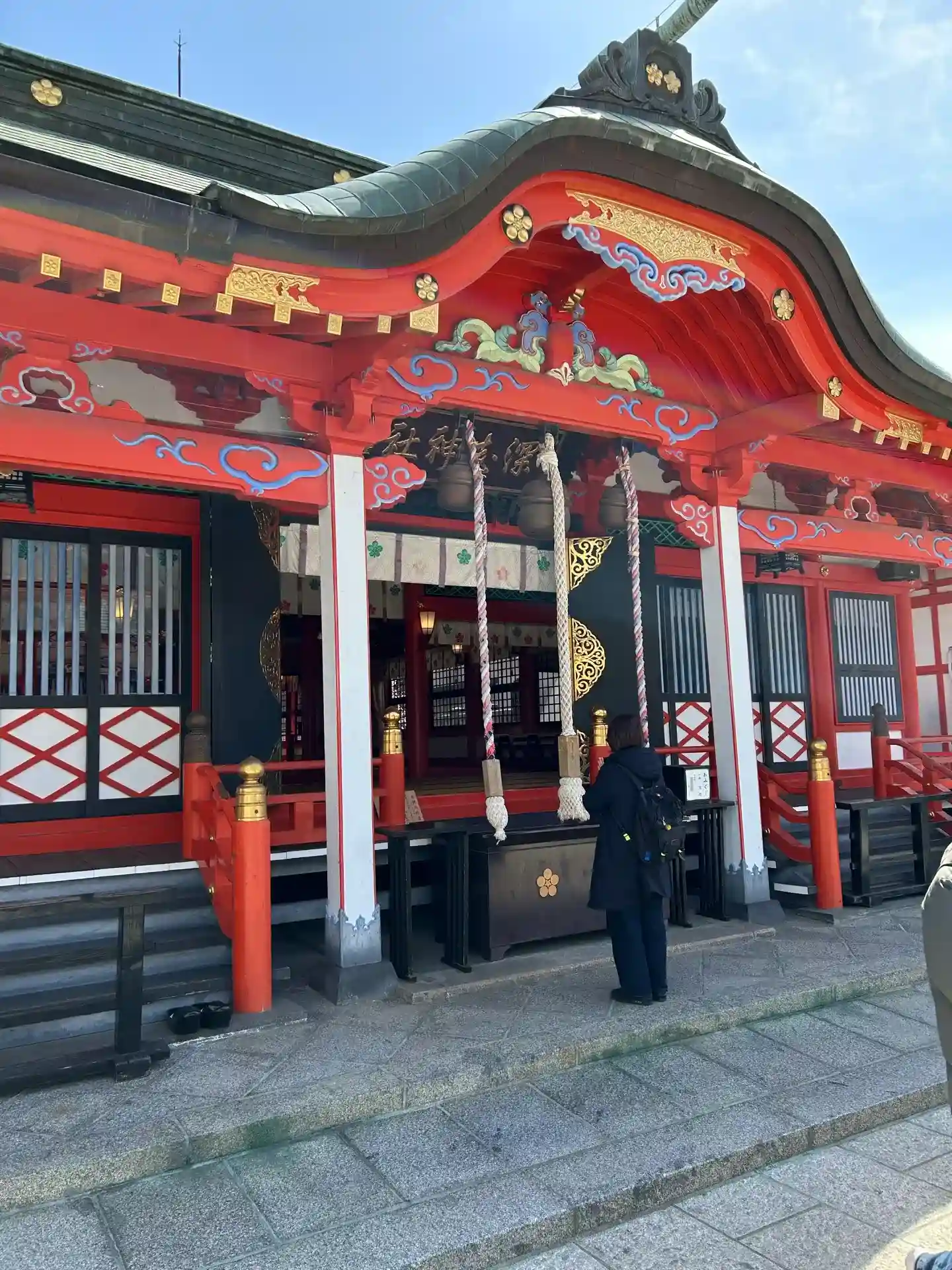 よく晴れた青空に朱い鳥居と社殿が映えます☺️ザワザワと風に気が揺れて気持ちの良いお参りでした^_^…