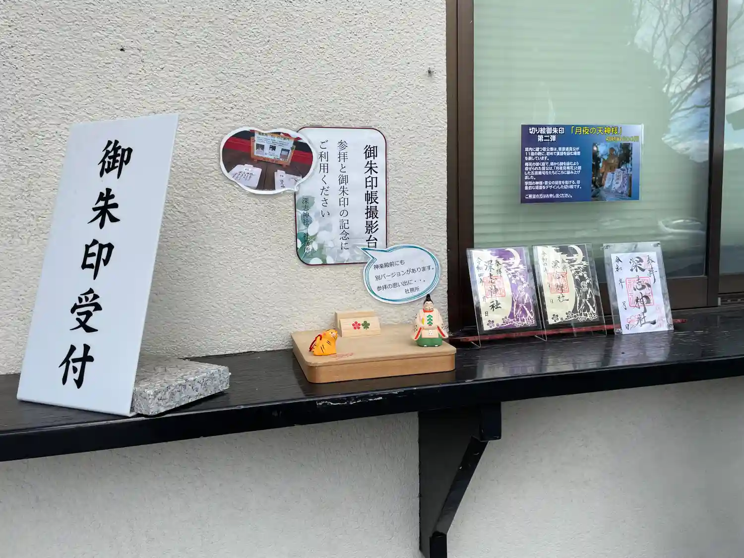 御朱印帳を立てられる台座?のようなものと小さな道真公の像が置かれているので、