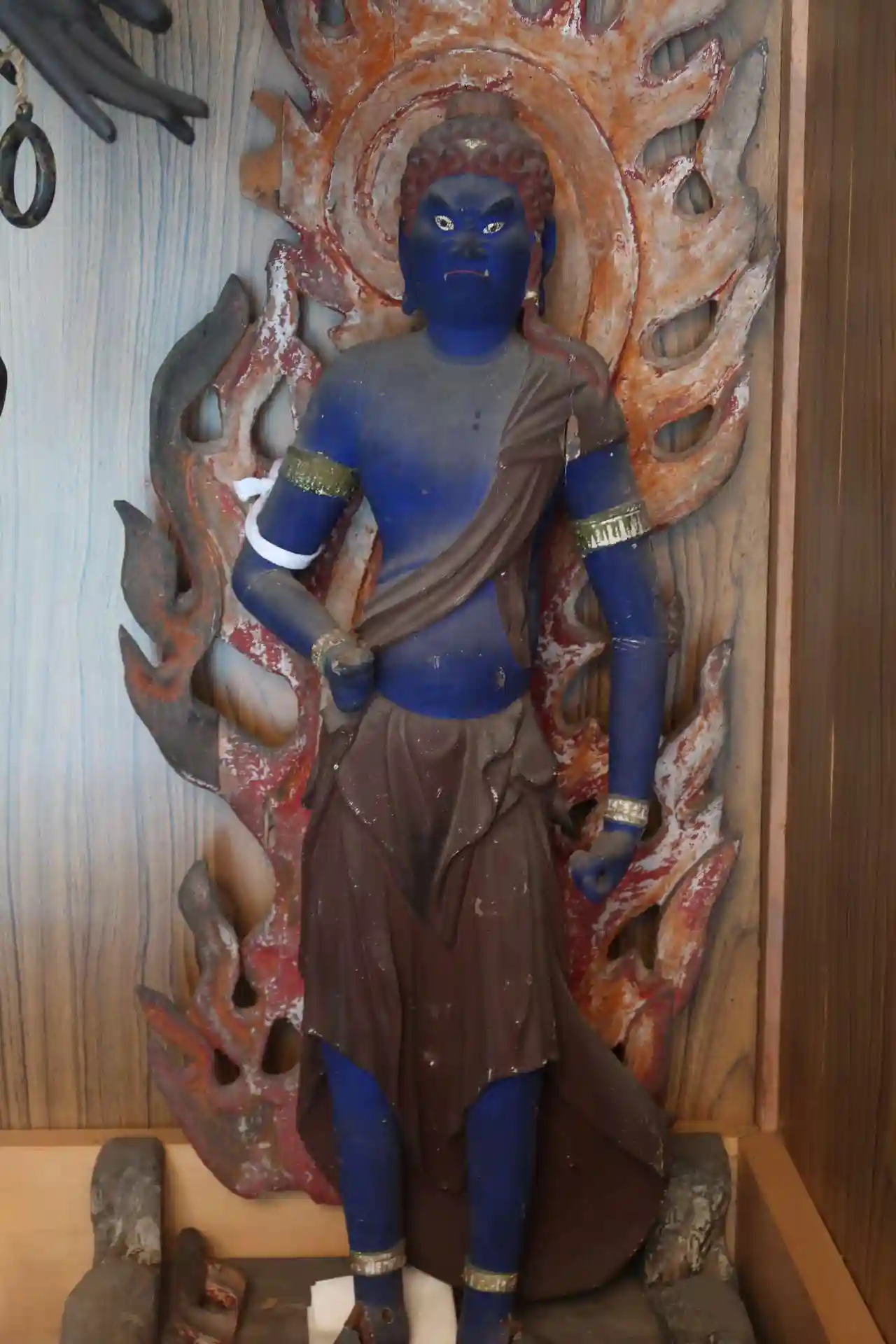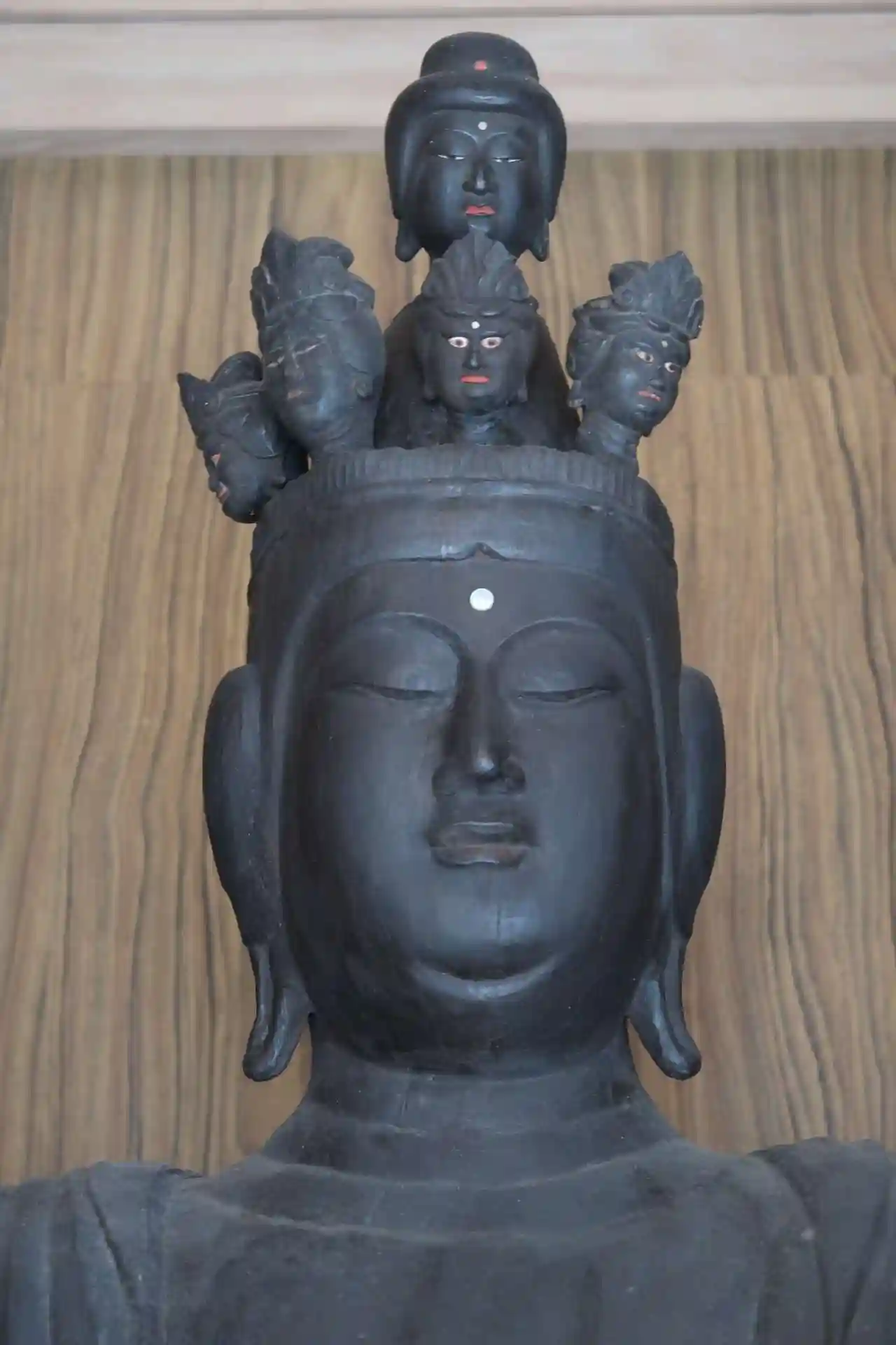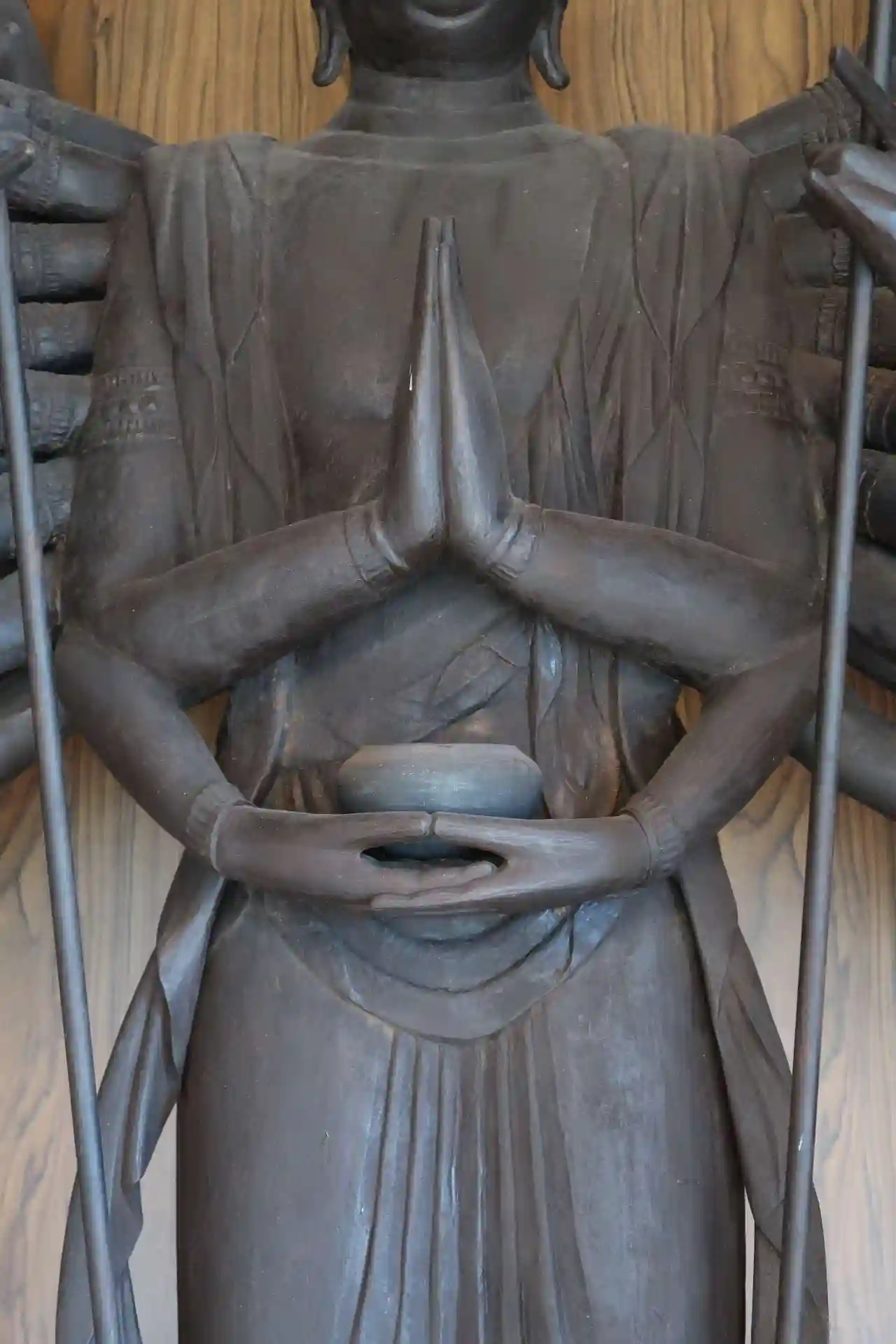 千手観音立像は、高さ約157cm、一木造、内刳は無し。股の膝下辺りに渦巻き模様が2つ。平安時代中期の作。お顔は面長で二重顎。体躯がやや細身だからか脇手が翼の様に両側に大きく拡がって見えました。(格好いい)