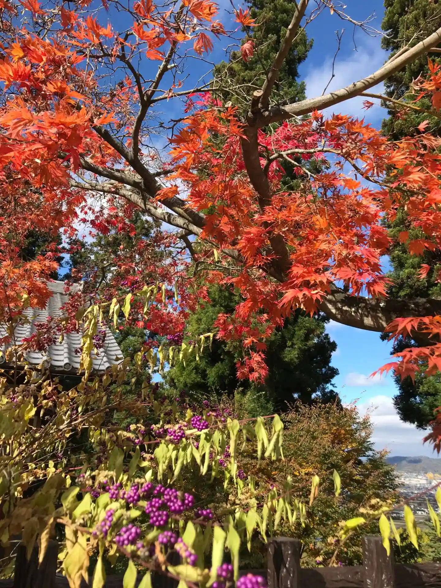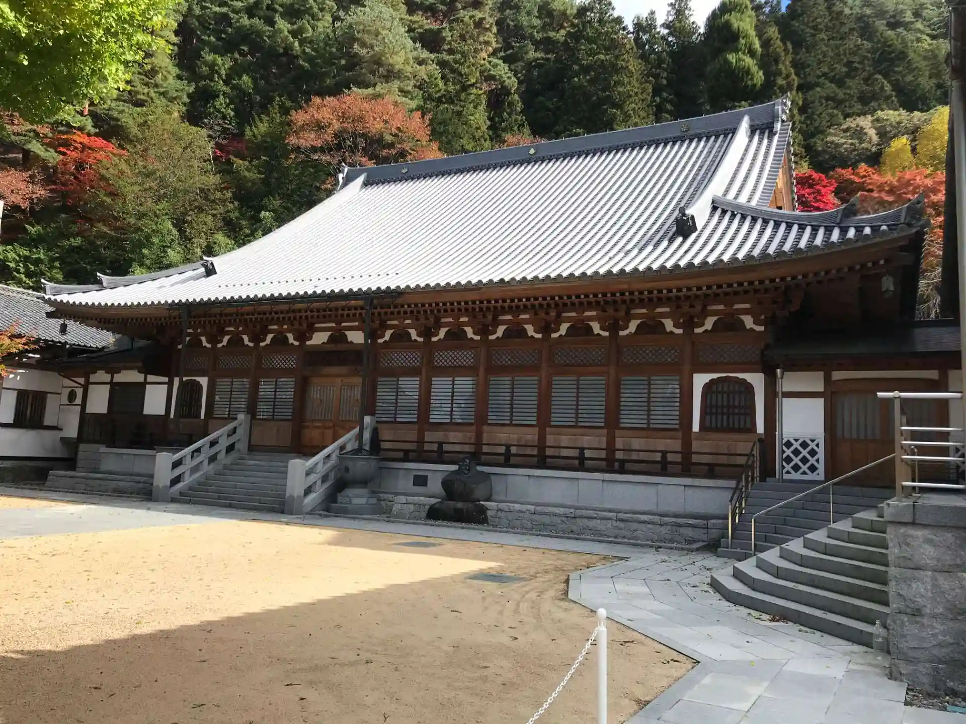 本堂が山の中腹にあるため、境内に続く参道はちょっとしたトレッキングコースのよう。麓は五分ほどの色付き、本堂付近は見頃、と紅葉のグラデーションが楽しめた。