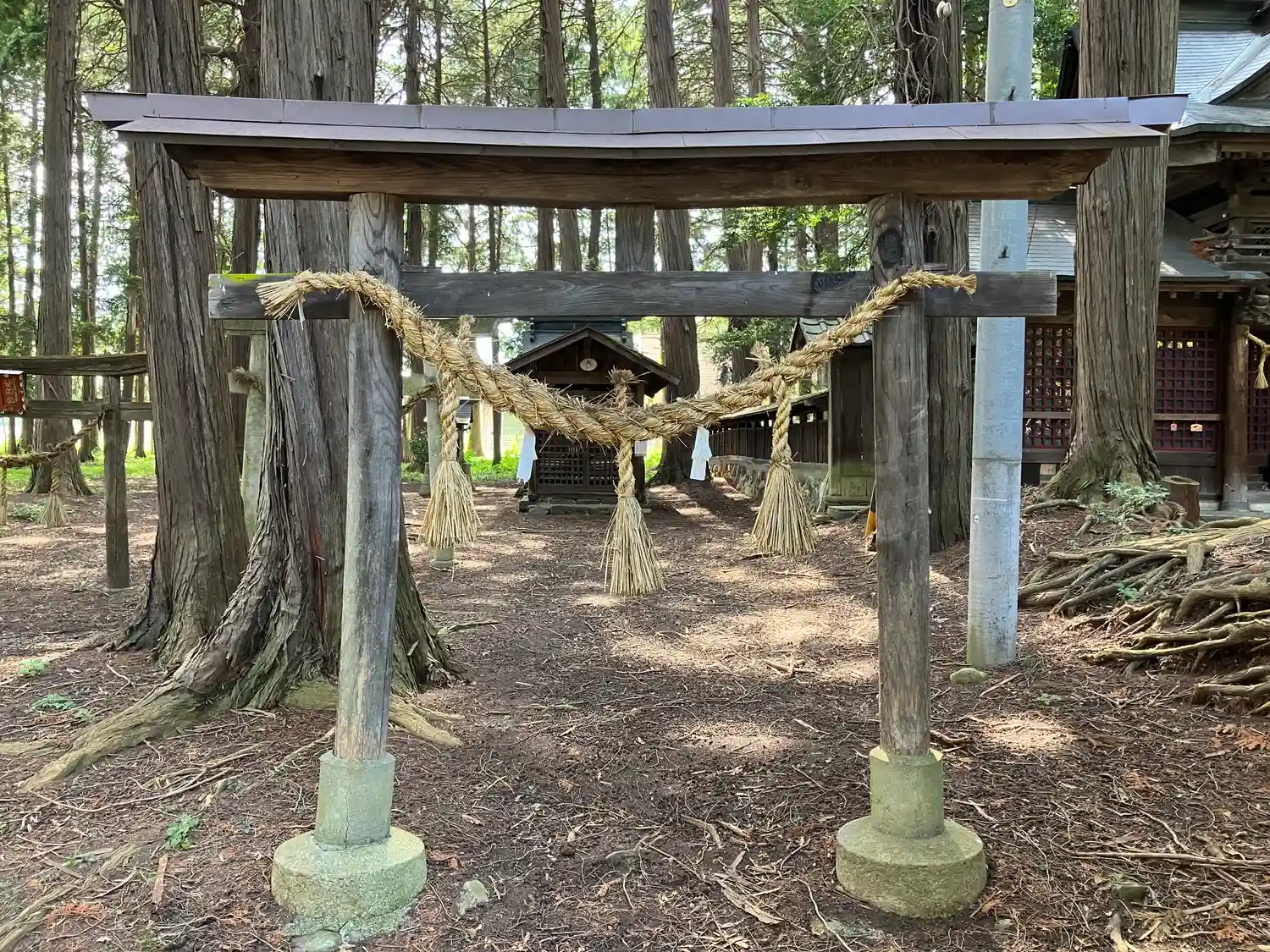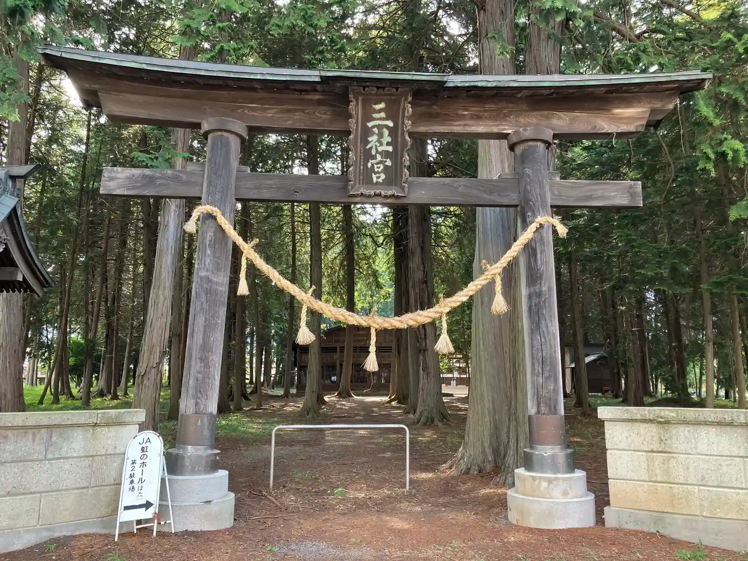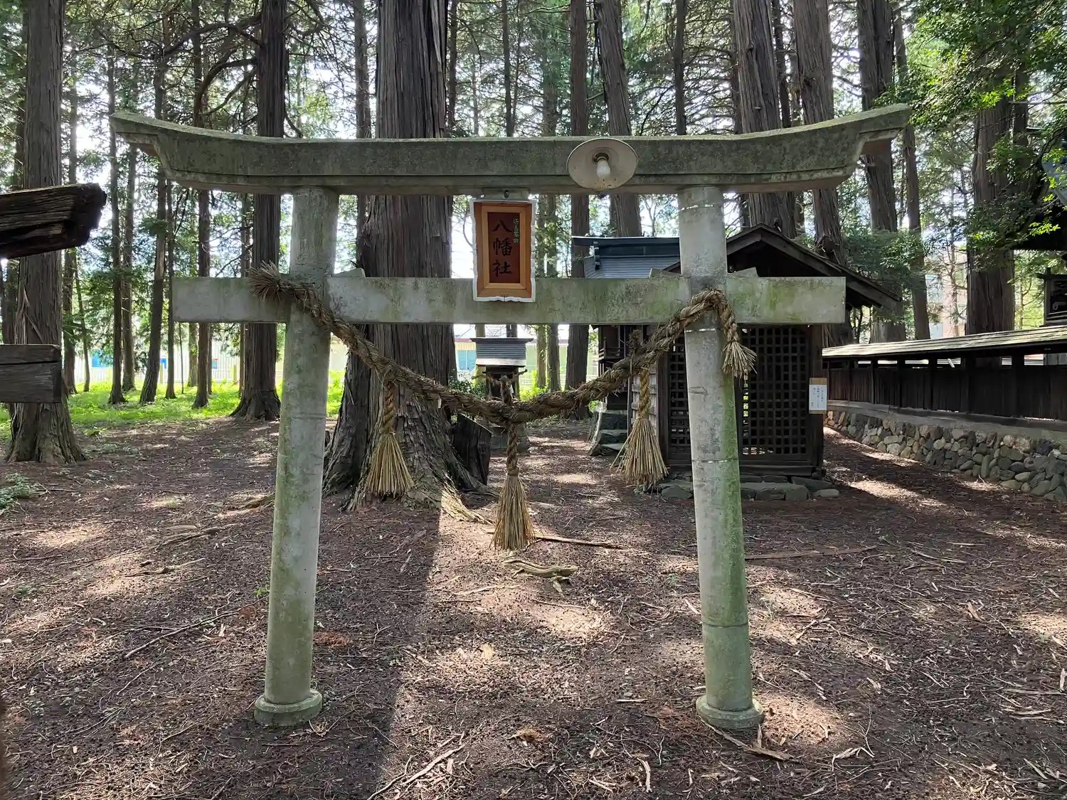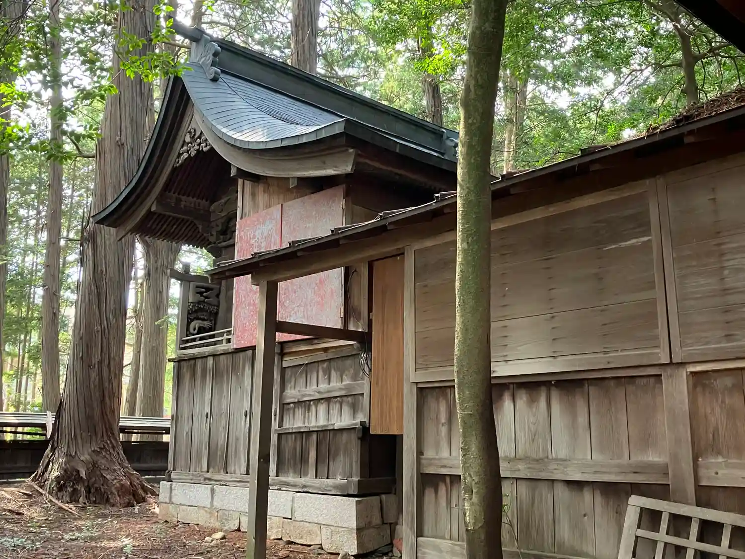 松本インターを下りて右側(西方面)上高地線(国道158号)を6、7キロほど、車で約11分の位置に、鬱蒼とした森林の中に静かに鎮座しています。木々から落ちた葉が積もりこんで、地面がふかふかになったところを進むと大きな神楽殿があり、中にはお祭りに使われる神輿が置かれていました。拝殿に向かって右側に山車安置の小屋があり、拝殿は諏訪大社下社のような荘厳な風格と歴史を感じます。龍🐉の彫刻が見事です。