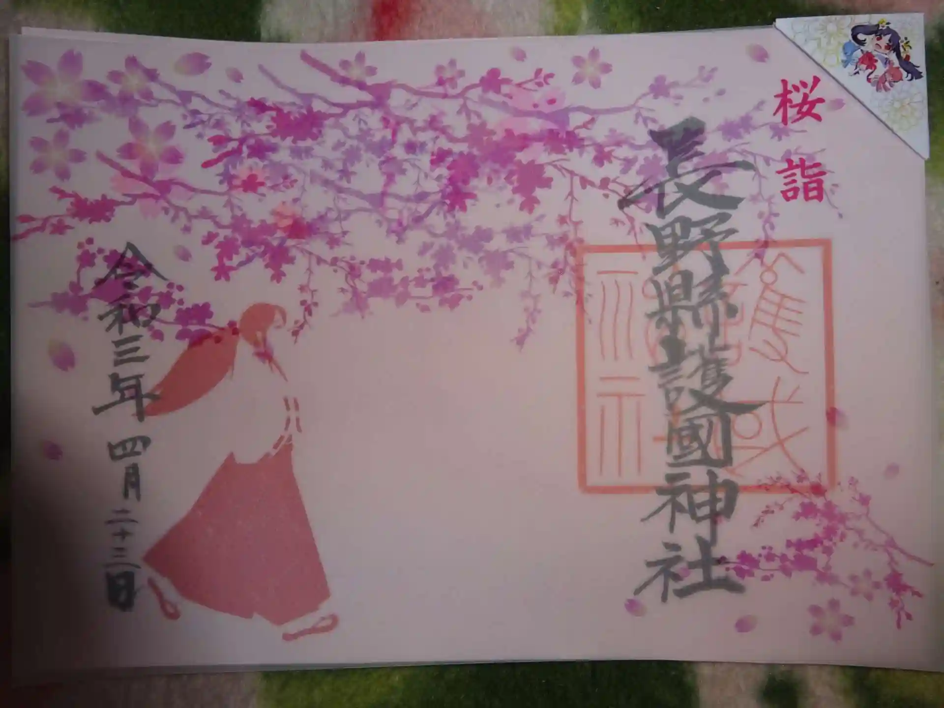 桜の御朱印 下地の巫女さん朱印にトレース紙の桜合わせ