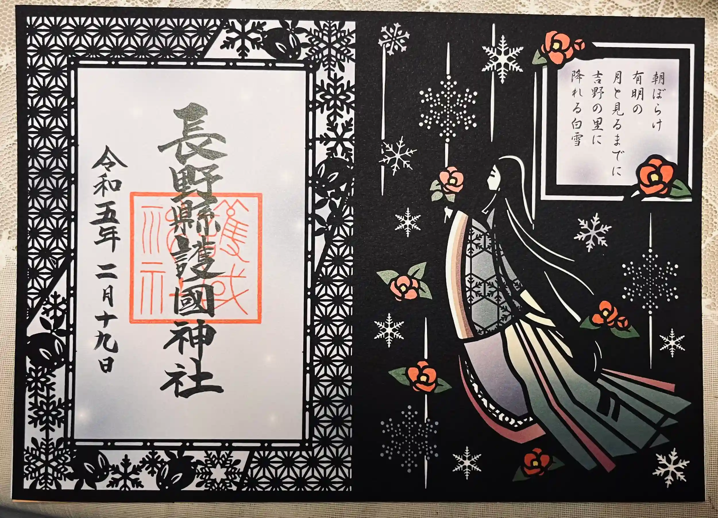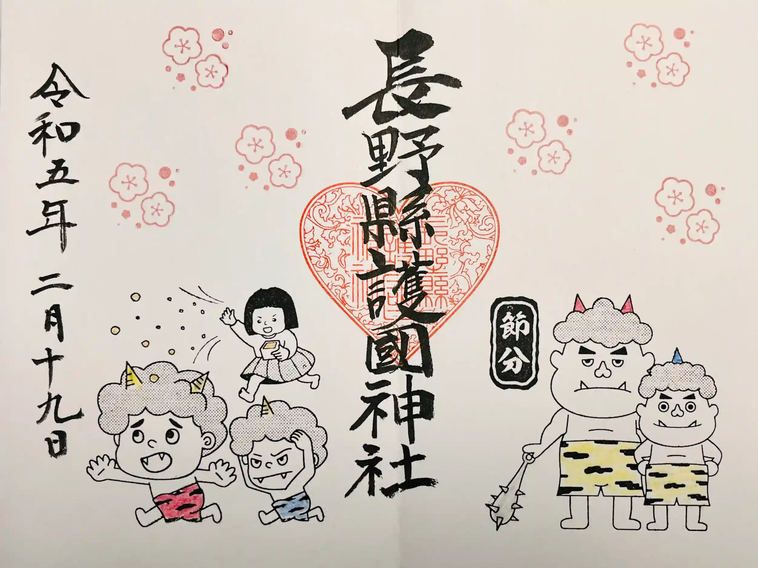 節分御朱印二体と折り紙で折られたお雛様御朱印、季節の切り絵御朱印です。