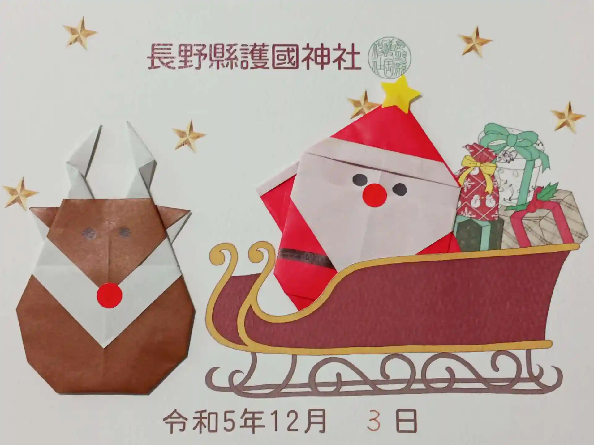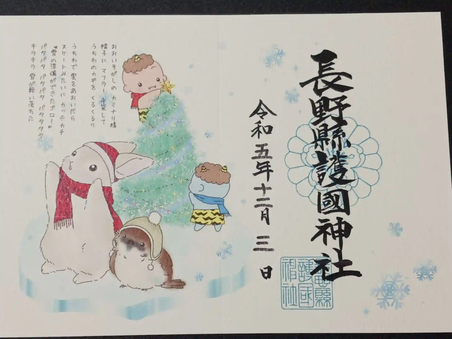 当初まだ頂いていない絵本の御朱印のみ頂く予定でいましたが、社務所で現在頂ける御朱印の数々を見たらまだホームページにも載っていない折り紙の御朱印(クリスマス)を見つけ、すかさずそちらも頂く事にしました。
