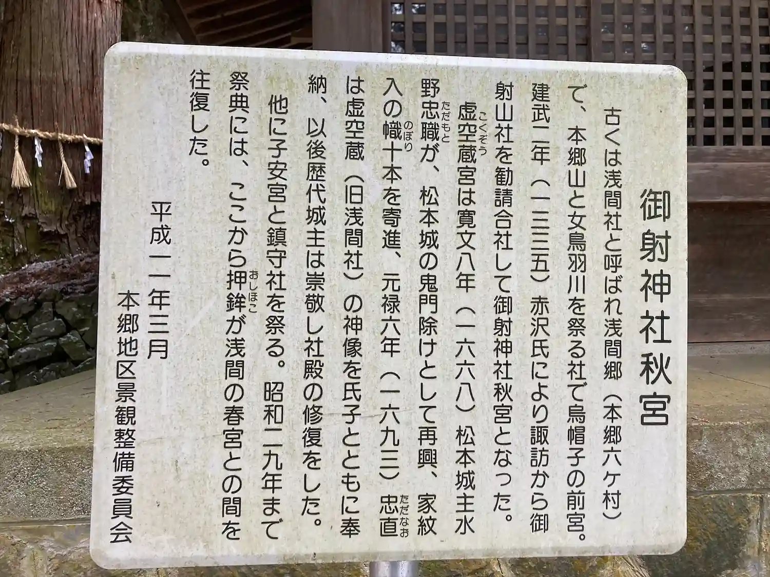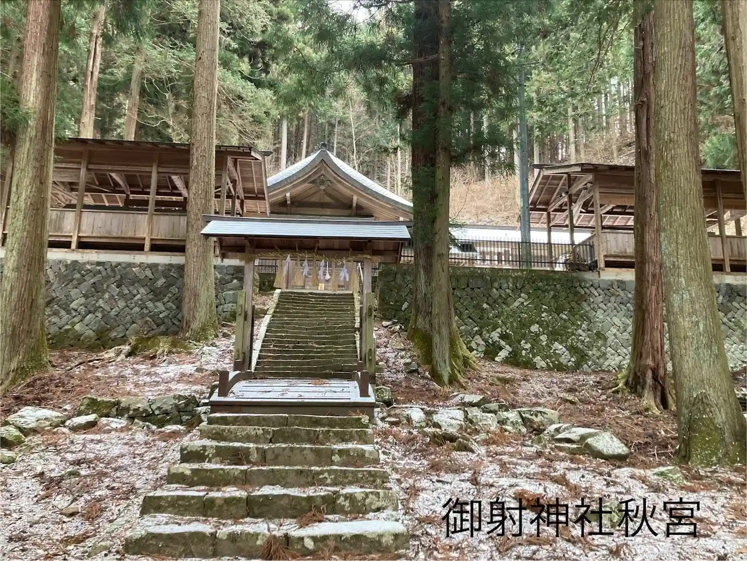 鹿教湯温泉に抜ける三才山トンネルの手前の道を右に入った集落に鎮座し、浅間温泉にある御射神社春宮の奥宮として御射神社秋宮と言われています。社殿は四宮あります。