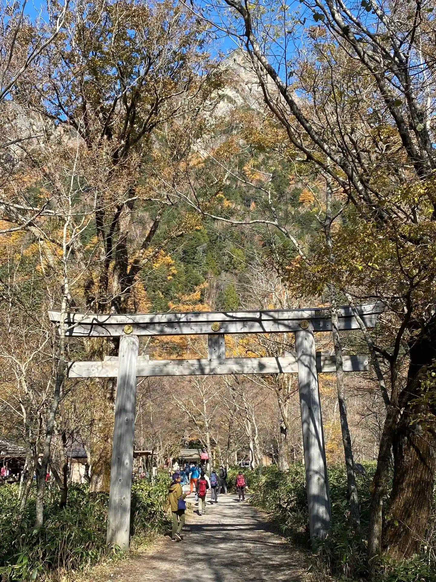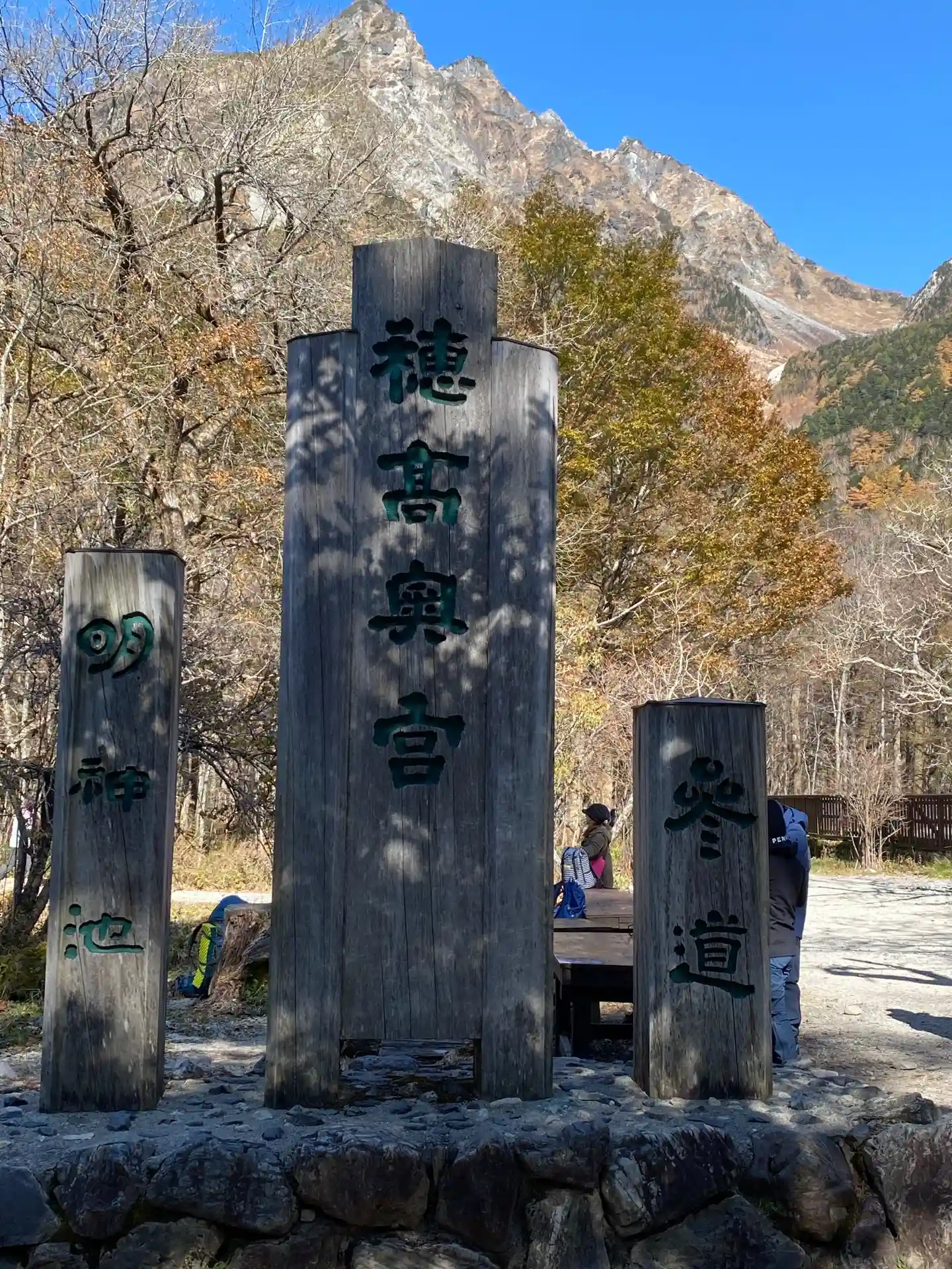 鳥居をくぐった先には山岳ガイドの先駆者の上条嘉門次のレリーフと嘉門次小屋があります。イワナの姿焼きが名物ですよ。