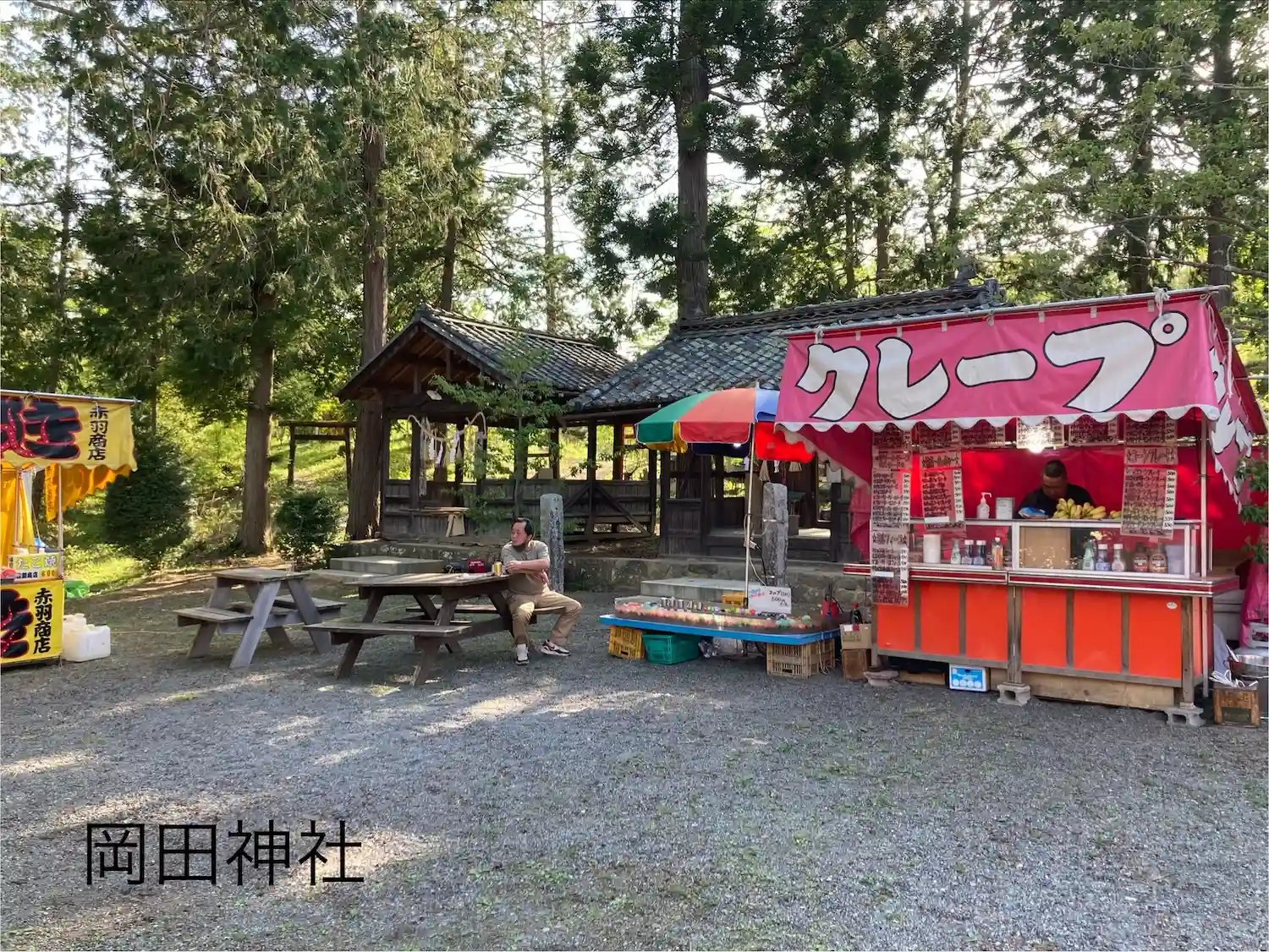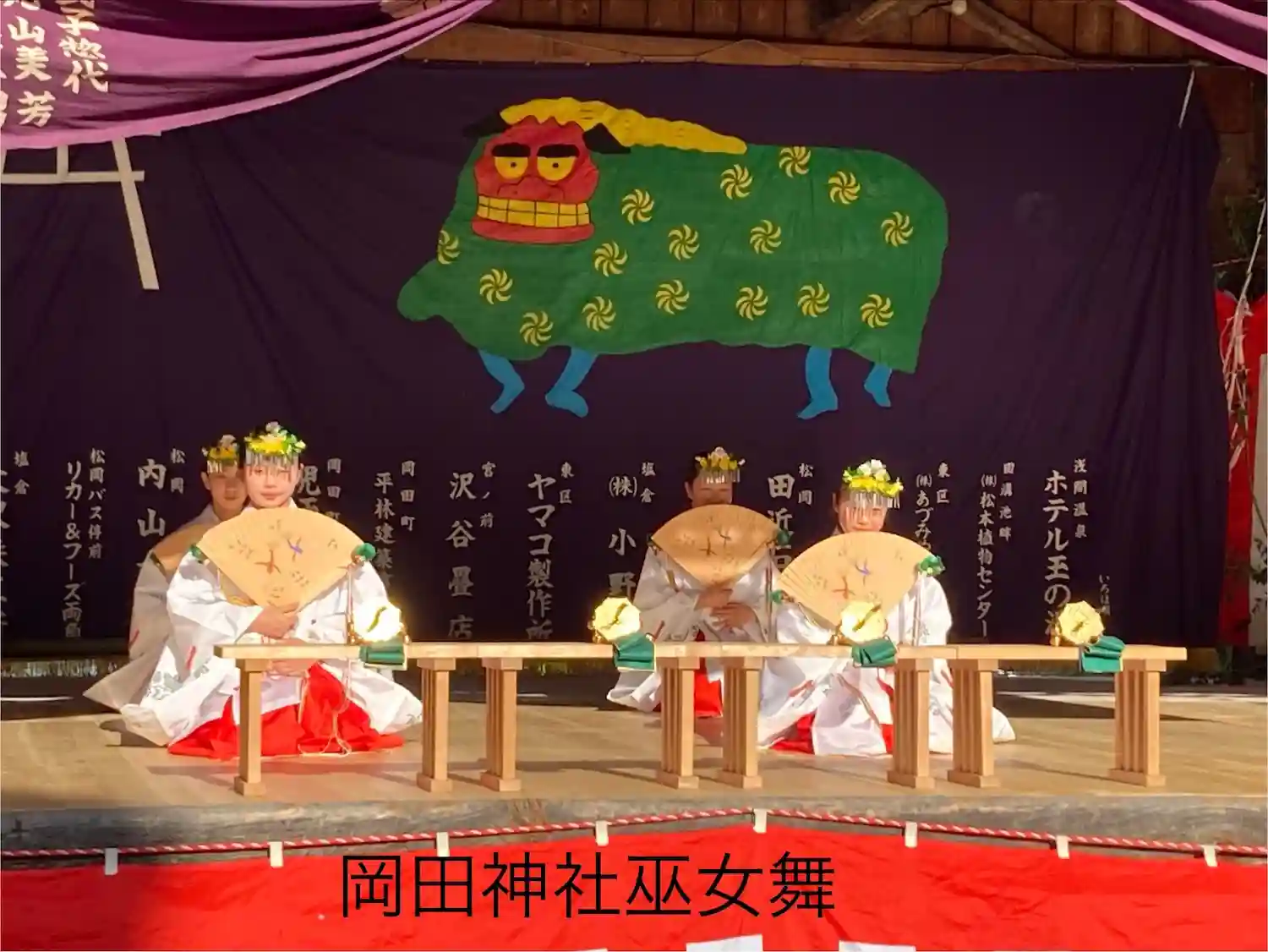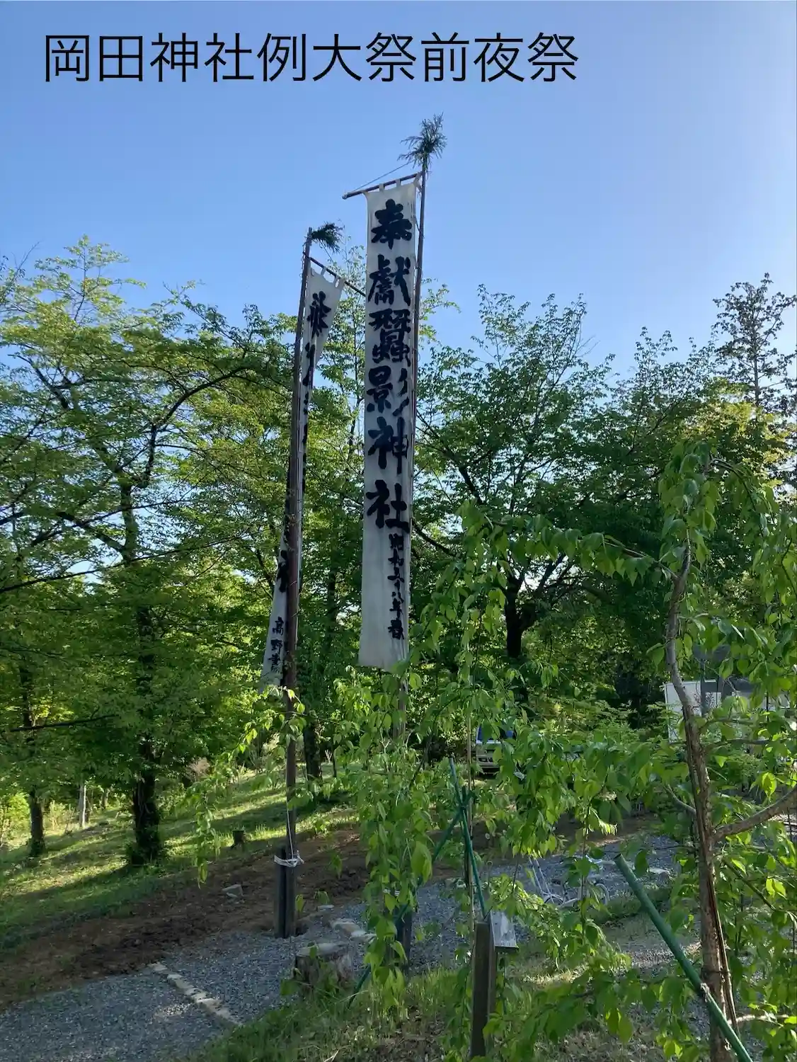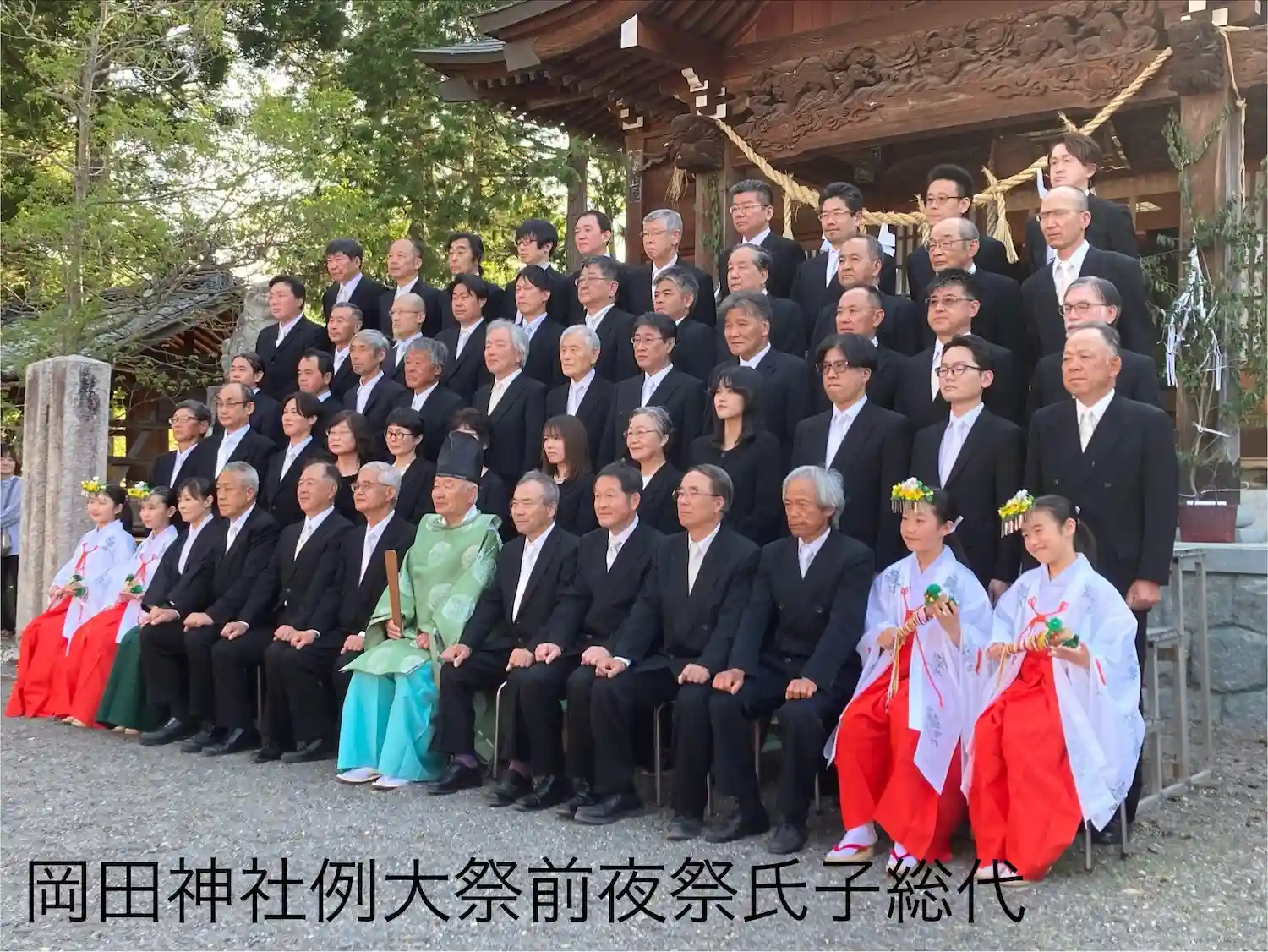 延喜式で式内社に指定された歴史をもつ岡田神社は、西暦654年五穀守護神として日本書記に登場する保食神(うけもちのかみ)を勧請し、その竣工式には中臣鎌足が参列したとも伝えられています。5月5日が例大祭で4日は前夜祭が行われ、巫女舞(稚児舞)や、神楽殿補修のお祓いなどが行われ、屋台も出て地元民で賑わいをみせていました。