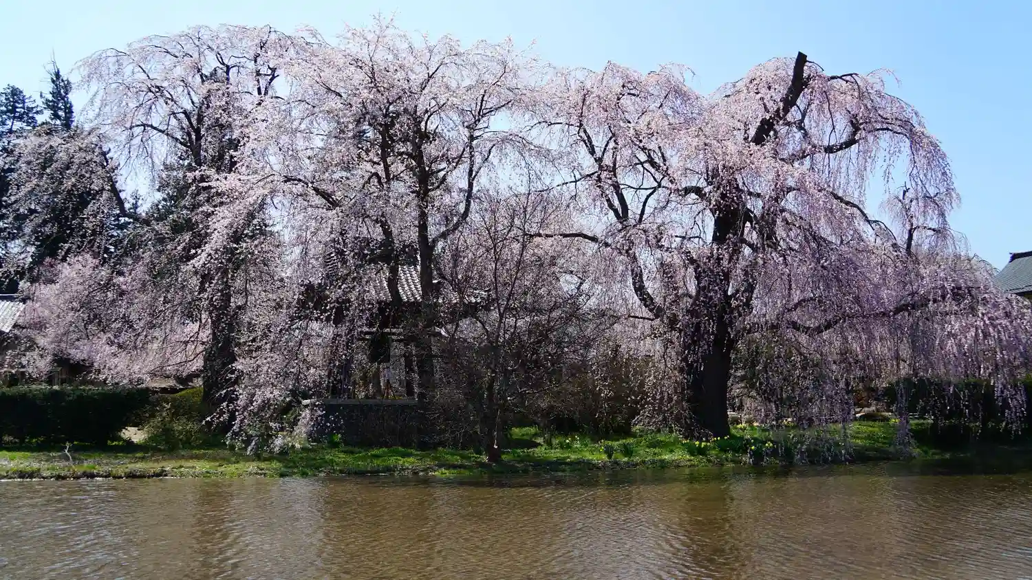 本堂と樹齢500年の枝垂れ桜