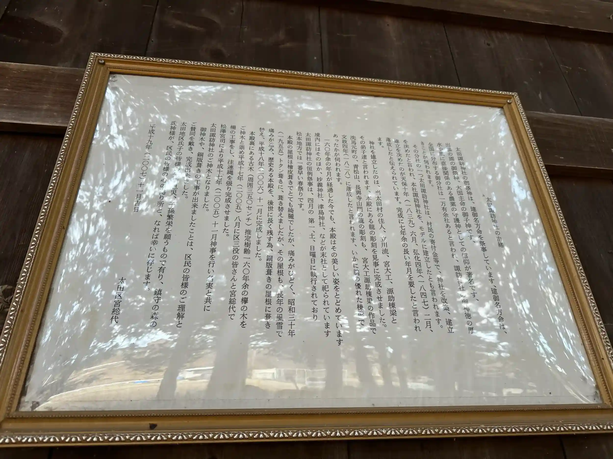 塩尻市洗馬にある諏訪大社の分社で、太田諏訪神社と呼ばれています。弘化四年(1847年)に建立と比較的近代に建てられた神社で、4月の第一土日に行われる当社の春祭りが松本地方では一番早いとされています。
