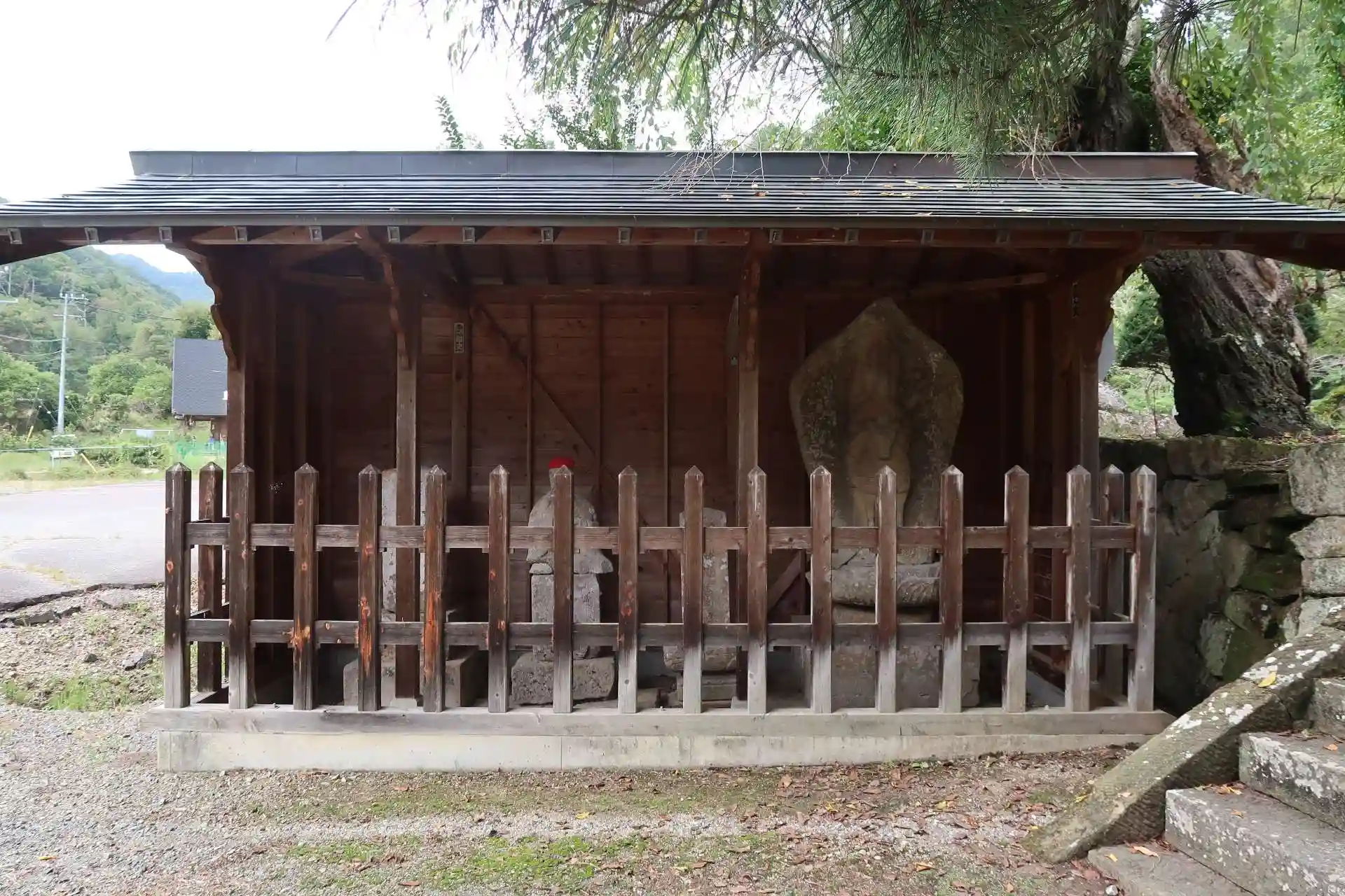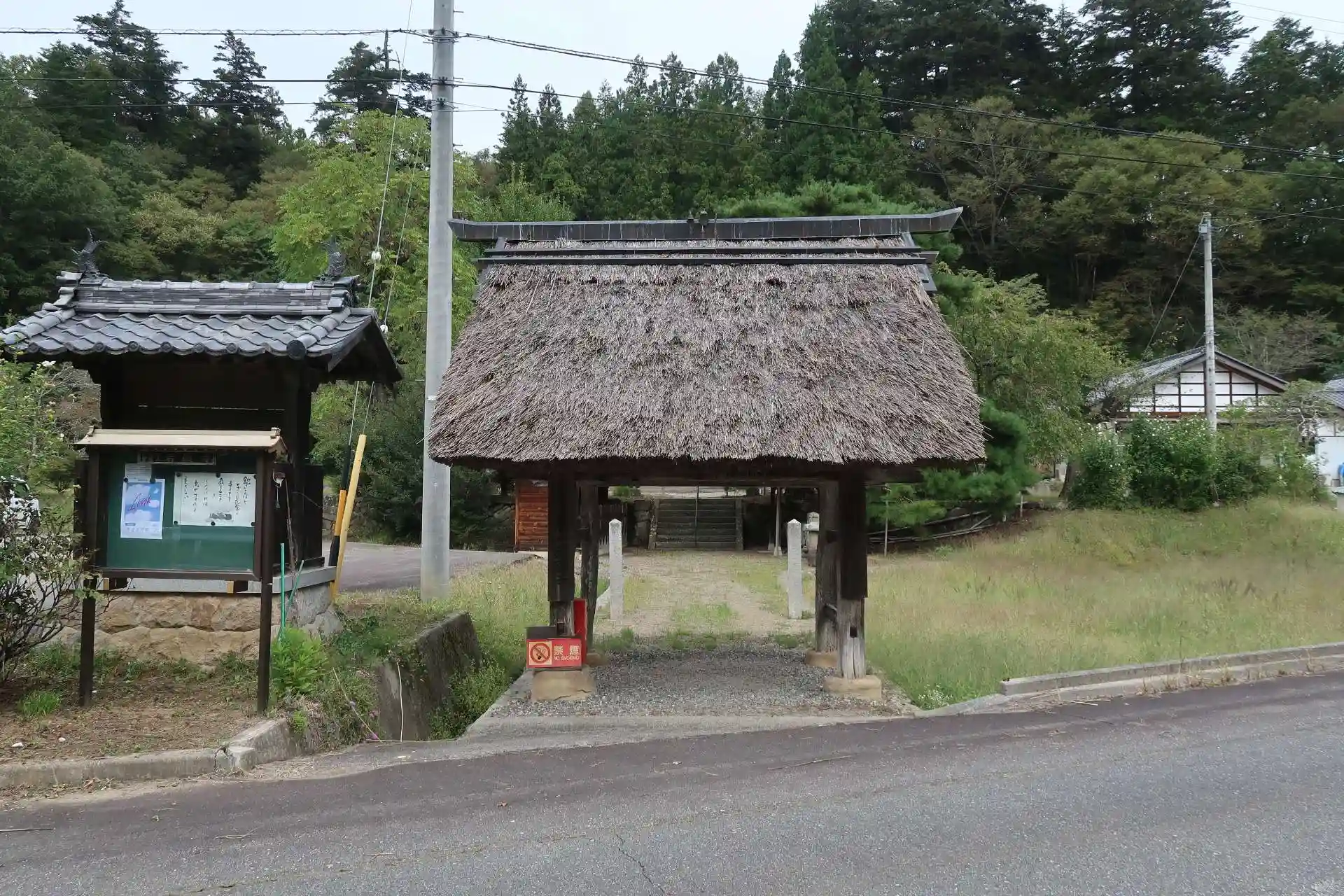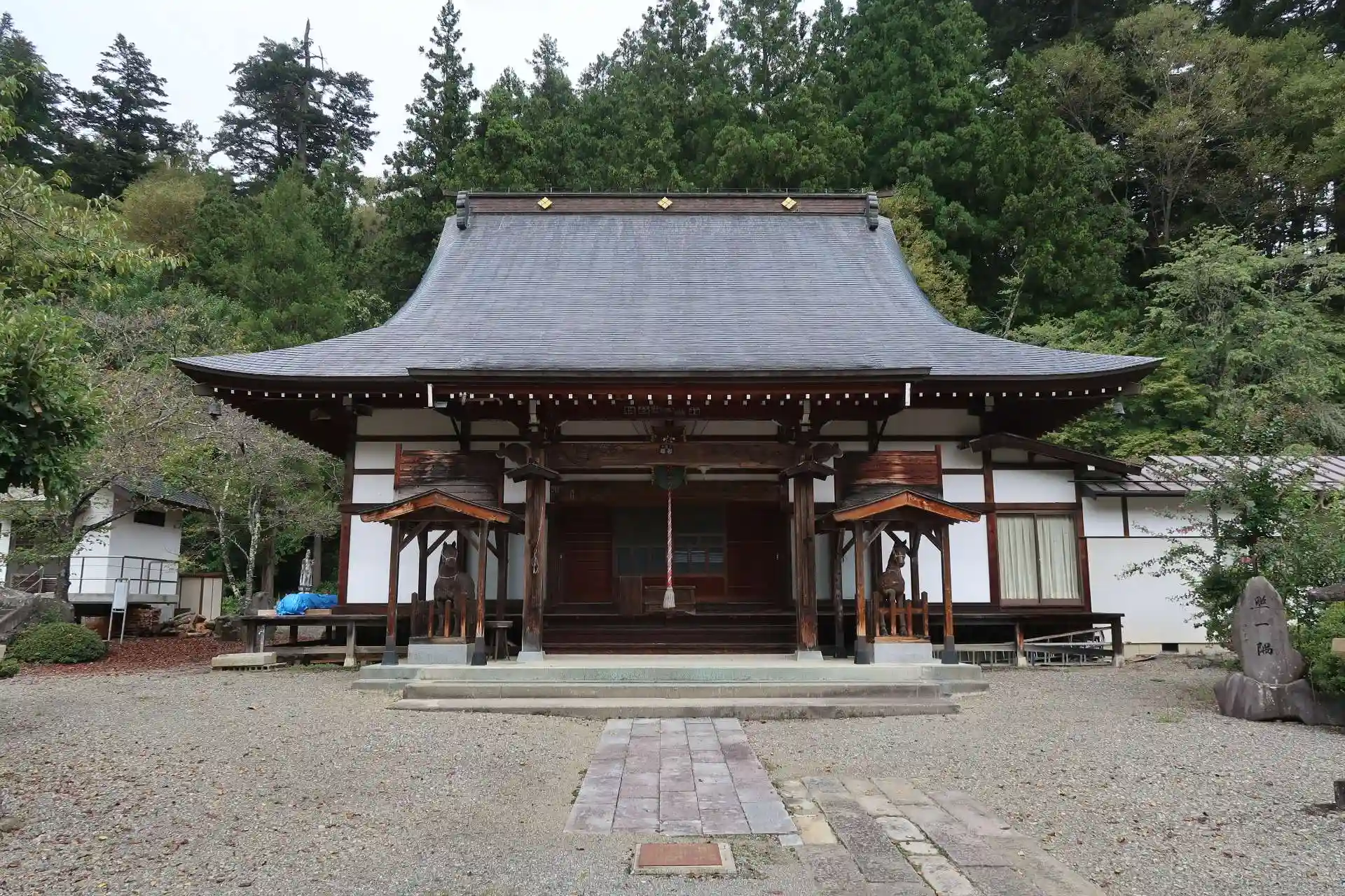 境内左側に広い駐車場がありましたので停めさせて頂きました。山門は小さいながらも茅葺きで趣きがあります。山門をくぐった先の右側に手水、左側に屋根付きの石像。馬頭観音があり、村指定文化財だと思います。その先に本堂ですが両側に木造馬像が置かれています。神社には神馬舎がありますが、寺院で見たのは初めてです。本尊が馬頭観音だからでしょうか。本堂は施錠されていましたので外から手を合わせました。